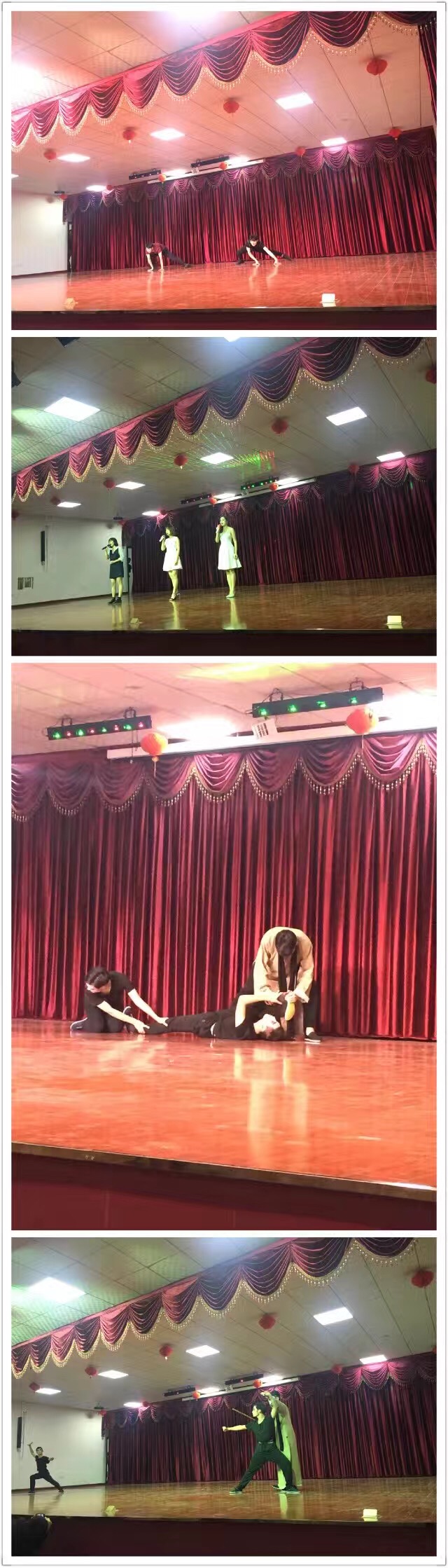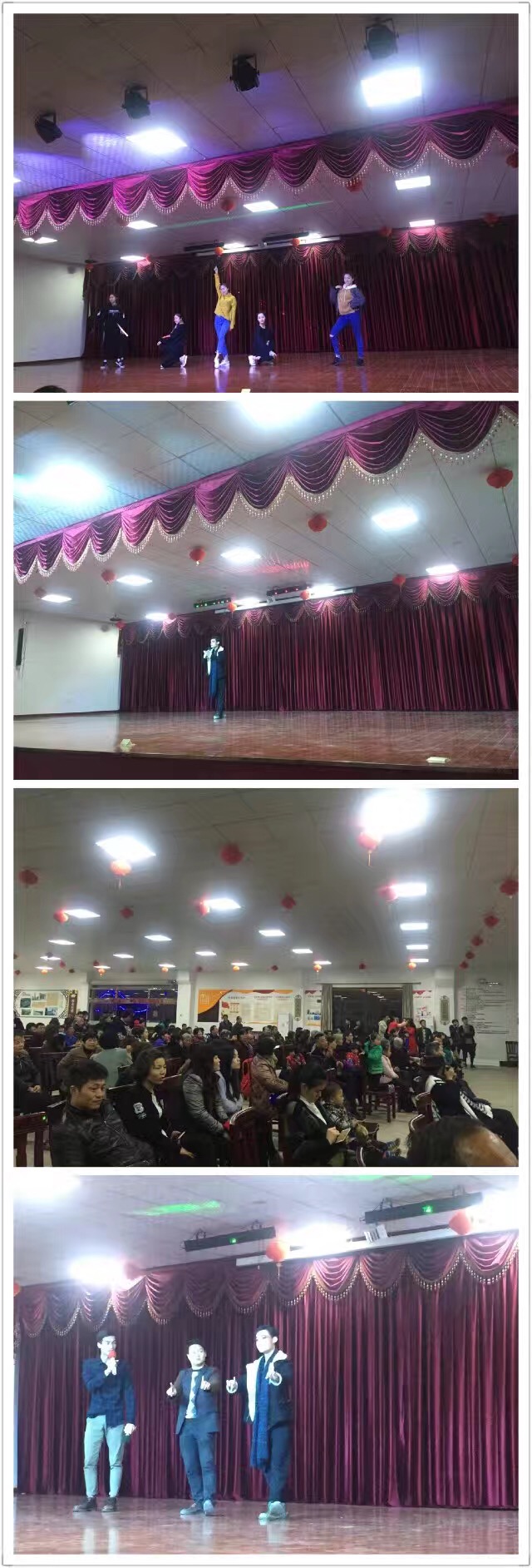 采风后,同学们来到南浔双林古镇的东双林村文化礼堂,开始了紧锣密鼓的彩排,为晚上的文化礼堂演出做准备。18:00,演出正式开始,舞蹈系同学们活力四射的开场舞引爆了乡亲们的热情,气氛随之热烈起来。紧接着,婺剧、小品、朗诵、舞蹈、越剧等节目一个又一个出场。最后一个节目《戏曲人生》,是16级越剧班同学们的原创情景表演,高难度的动作让观众们掌声不断。互动环节,村委文化干部自告奋勇上台学习越剧指法,并演唱了歌曲《好姑娘》,采访后得知他是北京齐鲁音乐学院科班出身,看来我们基层文化阵地也是藏龙卧虎。