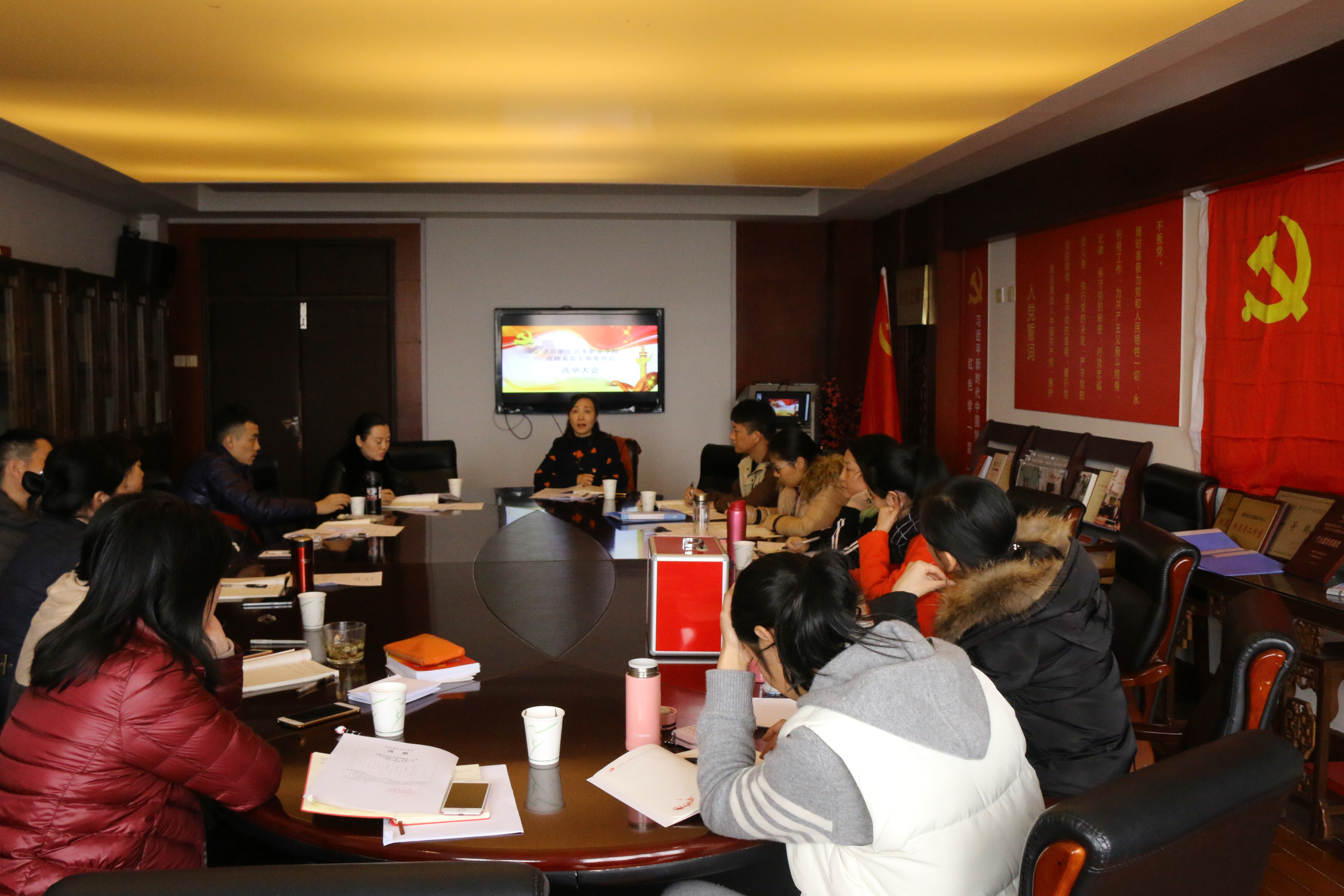 选举大会结束后,召开了新一届戏剧系党总支委员会第一次会议,就各自工作进行了分工:支涛同志任党总支副书记,许瑛同志任党总支专职副书记,梅跃进任组织(统战)委员,杨晓浤任纪检委员,颉顺虎任宣传(青年)委员。