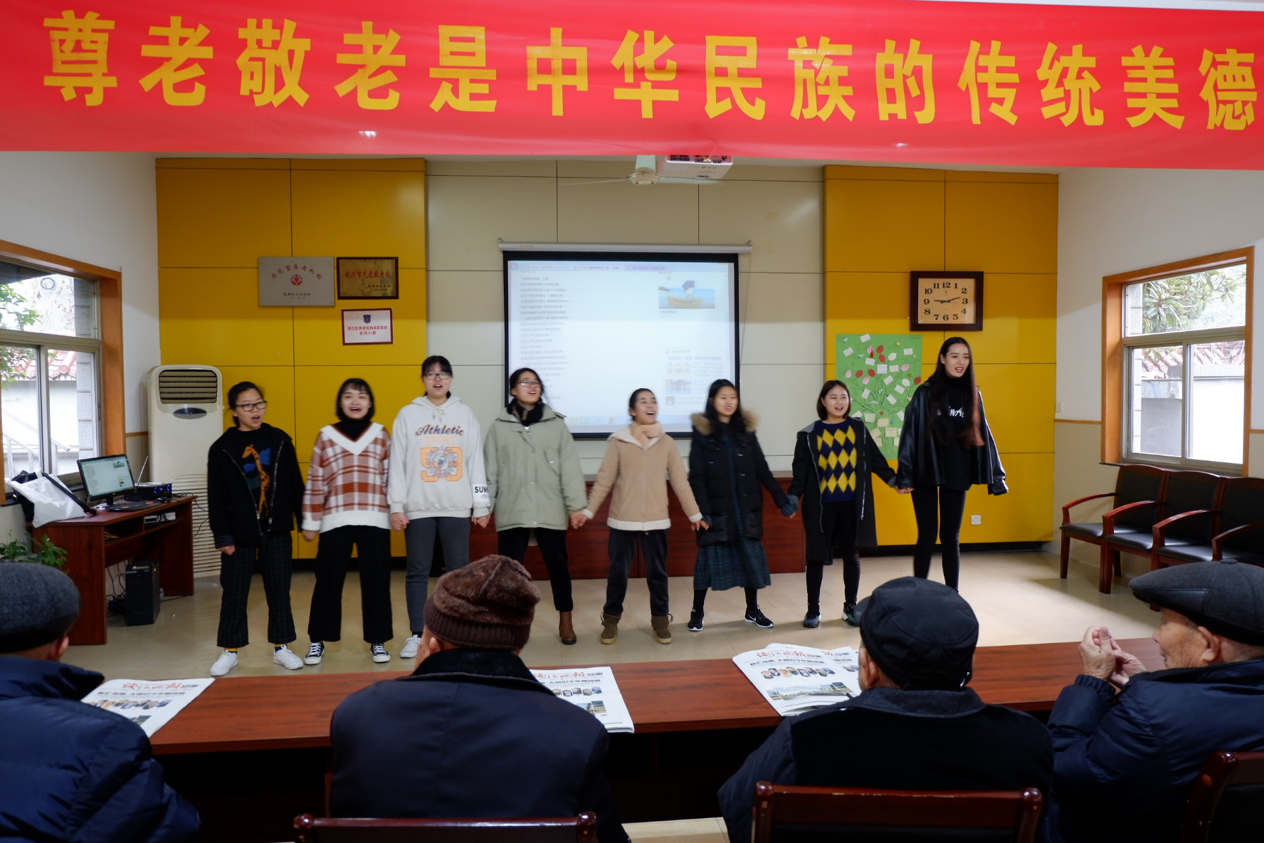 为弘扬中华民族尊老、敬老的传统美德,12月3日上午,东冠校区学生会组织志愿者前往滨江区长河街道敬老院开展“树敬老尊贤 弘传统美德”志愿服务活动。 上午8时,志愿者们为老人们送去了欢声笑语,献上了一份温暖和关怀。长河街道敬老院院长亲切接待了师生一行,称赞同学们的爱心善举。志愿者们贴心地将老人搀扶到活动室,表演了《歌唱祖国》《没有共产党就没有新中国》《外婆的澎湖湾》等精心准备的节目,老人们的脸上露出了温暖的笑容。有位爱唱歌的老爷爷还拿出了口琴和大家互动,94岁高龄的老奶奶表示很喜欢同学们准备的节目。志愿者们拿出自带的工具,帮助老人们擦窗台、抹扶手、整理房间卫生、修剪树枝、打扫院子,搀扶老人晒太阳散步,陪他们聊天看报、捶背按摩,听老人讲过去的故事,与老人分享自己的校园生活。 通过此次活动,志愿者们奉献了爱心,收获了感动,充实了记忆,并希望以此呼吁更多的人关注“空巢老人”这一社会群体,努力献出自己的爱心。 |