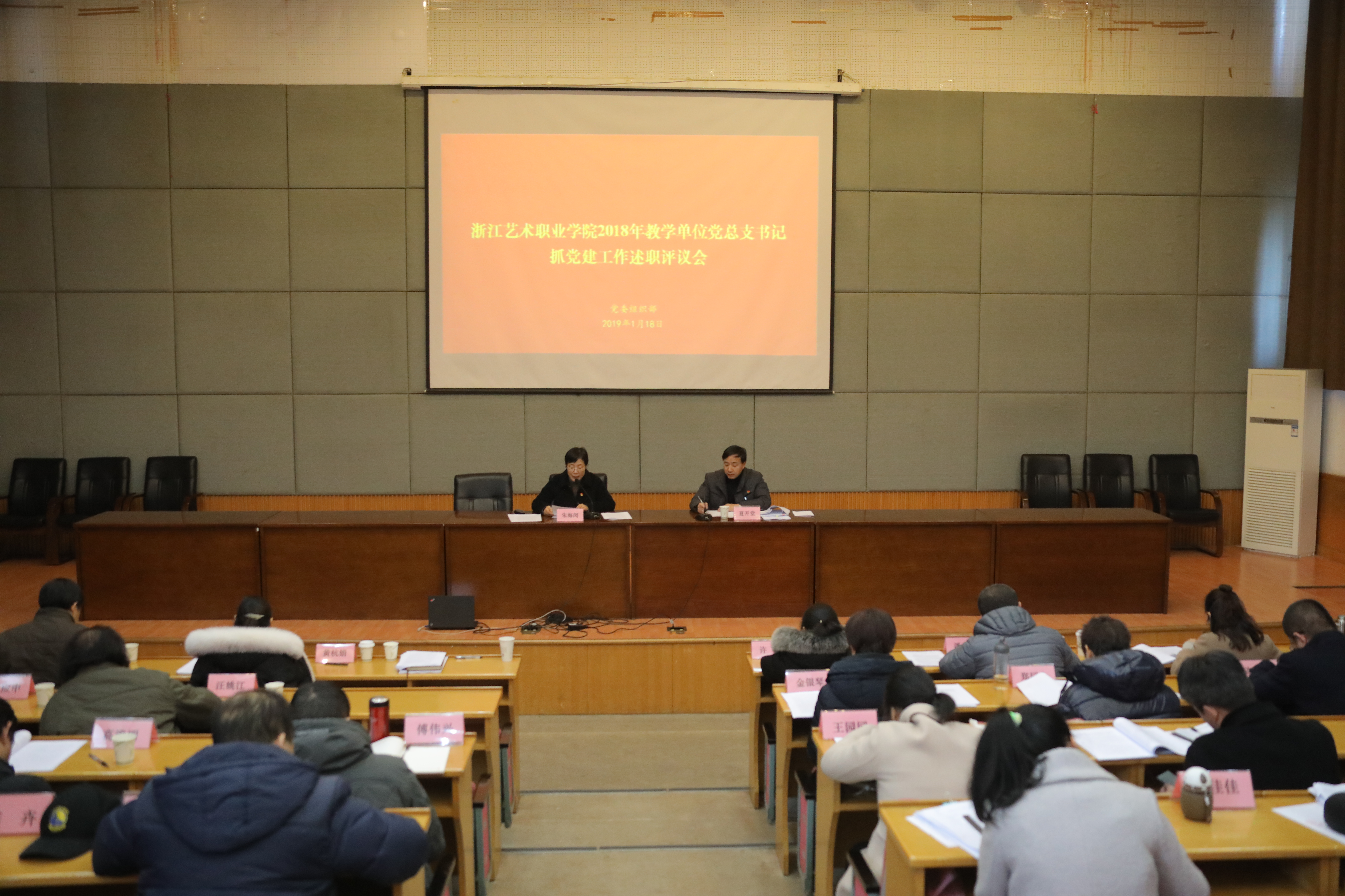 1月18日下午,浙江艺术职业学院2018年度党总支书记抓党建工作述职评议会在学校图信报告厅举行。校党委书记朱海闵,院长、党委副书记黄杭娟等校党委班子成员出席,职能部门和教学单位党政负责人、各基层党支部书记代表和教师代表等50余人参加述职评议会。会议由校党委副书记夏开堂主持。