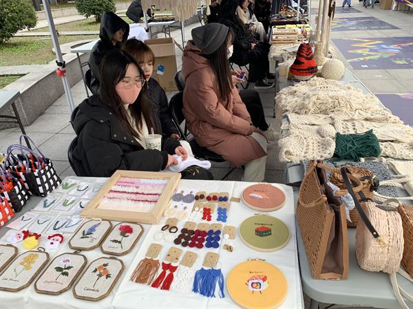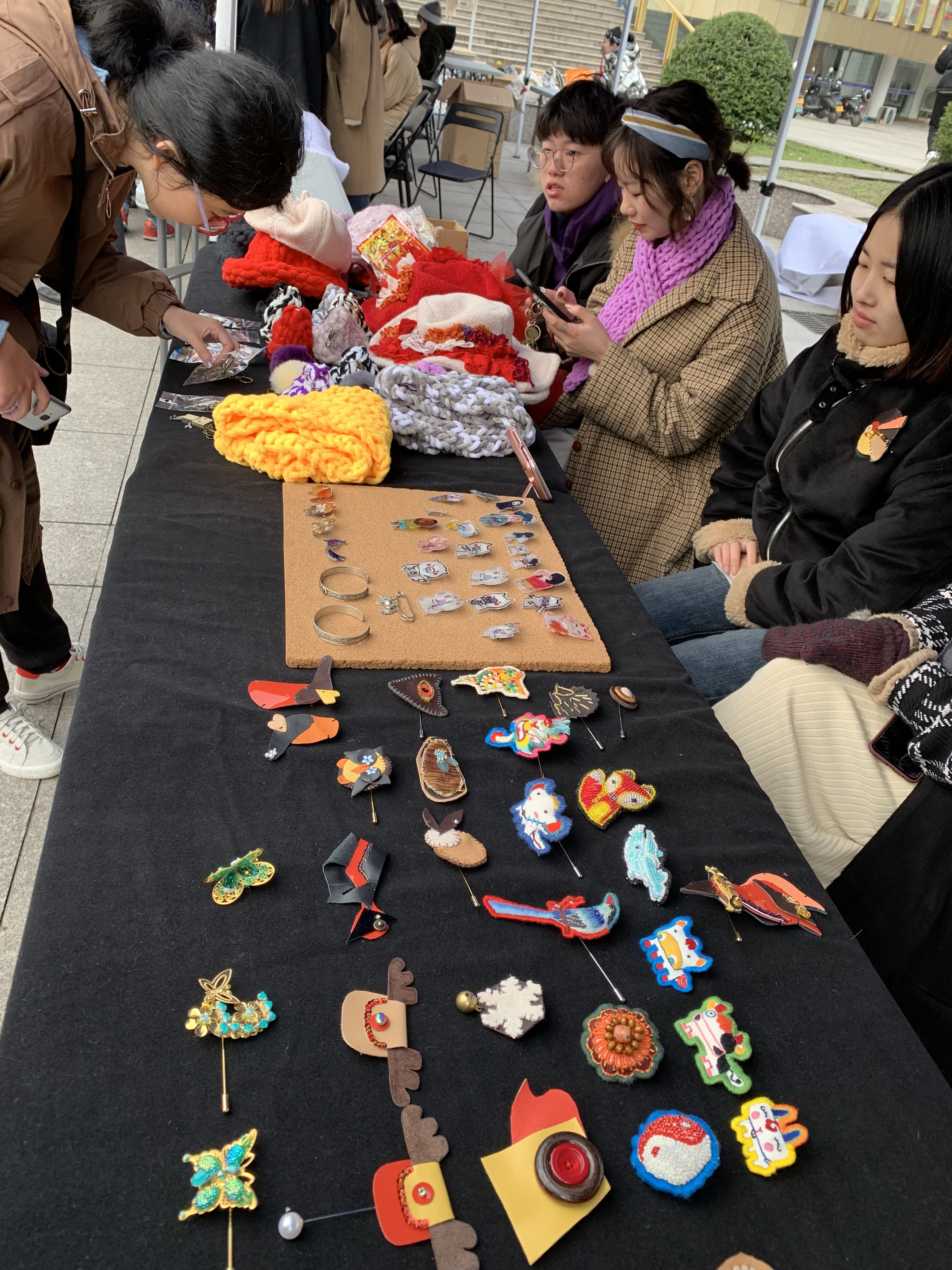 走进红色的“彩虹门”,便能看见那摆放在摊位旁的“小胖子”。这一处是广告创意产品,主题是“变形记”,展卖的有红色小胖子形象的贴纸、文件袋、健身日记、水杯等,创作者们介绍,这个设计是想要大家树立科学减肥,科学健身的理念。现场还能参与中奖机率较高的抽奖活动。“天绮咏古” “覆海”两组产品的灵感来源于敦煌壁画,设计者们希望年轻人能更多地喜欢中华传统文化,产品有抱枕、帆布包、红包等等。带着水果图案的手机壳、钥匙扣、眼罩、闹钟、水杯等“弄器”系列创意产品,旨在将健康知识传递下去,呼吁大家珍爱生命,养护器官,从年轻开始。“良渚玉器”摊位展卖的小首饰、手机壳、丝巾、抱枕等各类小产品精致美观,也有不少人购买。动漫设计的主要产品衍生于一部动画,有饰品、卡通人物、小场景、手提包、小布袋、动漫人物等。环境设计摊位是大家亲手织的围巾、帽子,编织的手提包、手环,样式精美,别出心裁。天气有些冷,可既是创作者又是零售商的同学们热情不减,向来往的人们推介着自己的产品。入了夜,创艺市集点亮了灯,有满载而归的买家,有热情似火的卖家,热热闹闹。学校领导、老师们也纷纷到市集里“淘宝”,支持同学们。