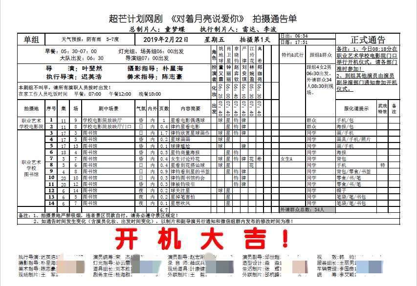 非常开心能够成为《对着月亮说爱你》工作组的一员,这是我第一次参与大型剧组的外联工作,不管是导演跟摄影组的沟通,灯光组对于灯光的呈現,还是美术服化组对于拍片的态度,都让我学习到了不少,也更加明白了剧组组员间团队相互配合的重要性,希望自己在今后拍摄作品的过程中也能做的那么好!