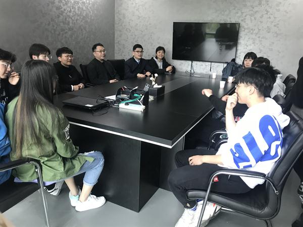 此行教学团队还参观了时光新影教育的线下课堂学习环境,并就我系9名已经加入了时光新影教育后期制作培训学校影视剪辑、栏目包装及后期合成等相关课程学习的同学的学习情况进行了专题座谈。
