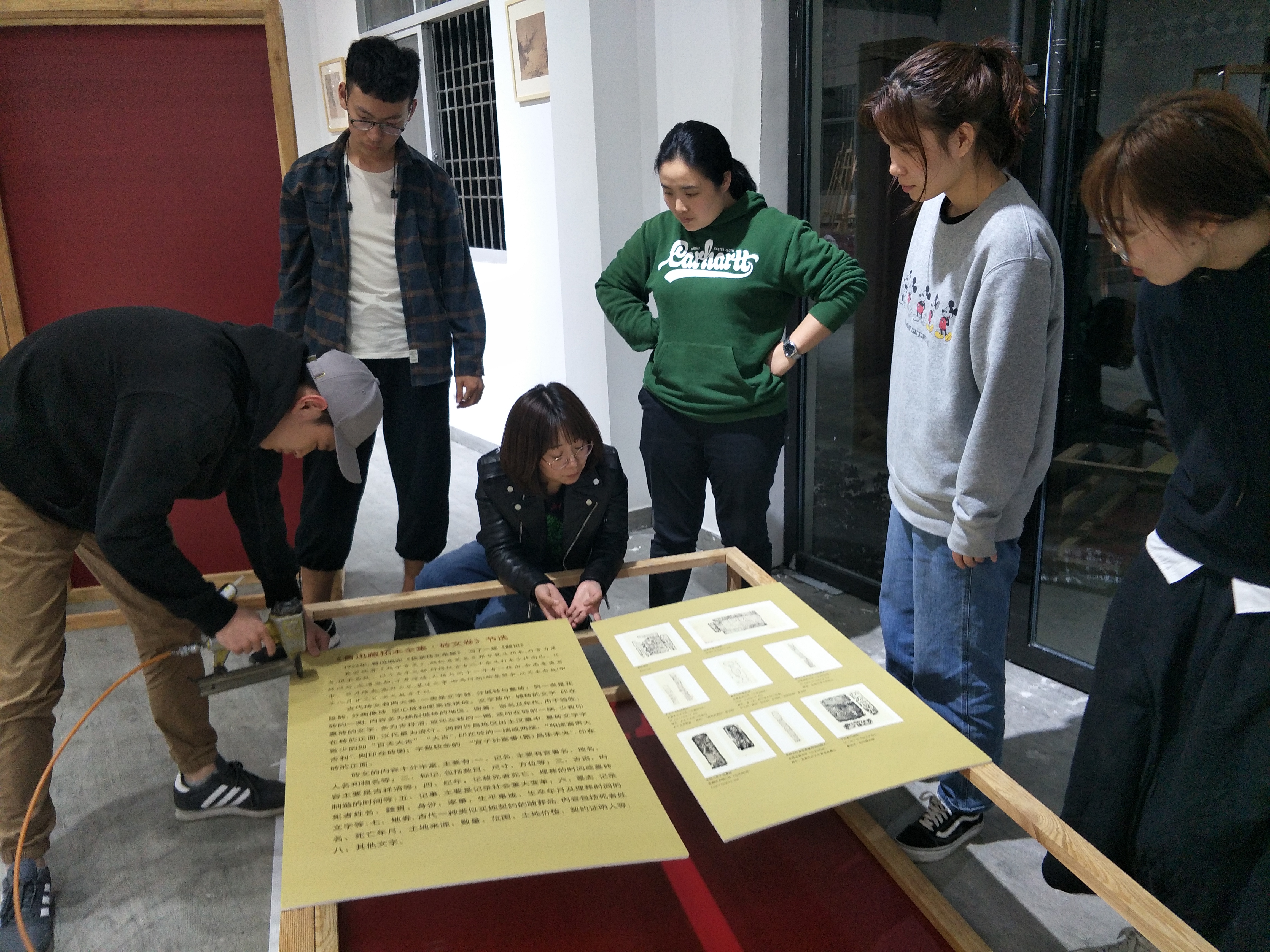 为提高展厅与效果图的接近度,同学们在现场做了二次数据记录。经过一天整理,大家对礼堂整体布局进一步了解,在制作材料到达现场后,大家立即分组进行布置陈列,根据实地环境,在老师指导下不断进行调整与修改。