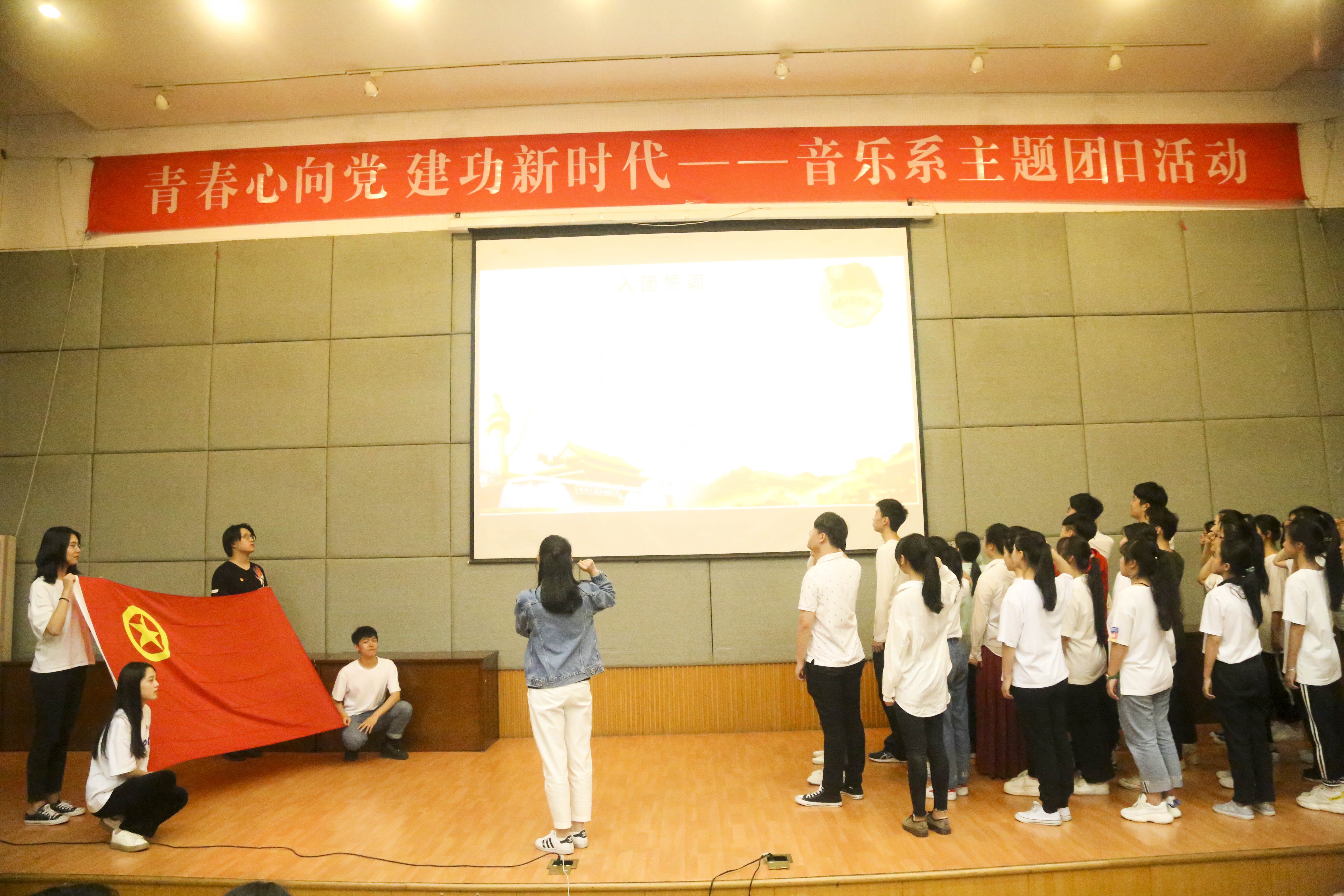 百年青春心向党,矢志建功新时代。5月5日,浙江艺术职业学院音乐系在学校图信中心报告厅举行纪念五四运动一百周年“青春心向党 建功新时代”主题团日活动。校团委书记郑吟、音乐系党总支专职副书记谢志勇、全体辅导员、团员代表、入党积极分子、党校学员以及全体团干部等近两百人参加。音乐系团总支书记主持团日活动。在庄严的国歌声中,团日活动拉开序幕。