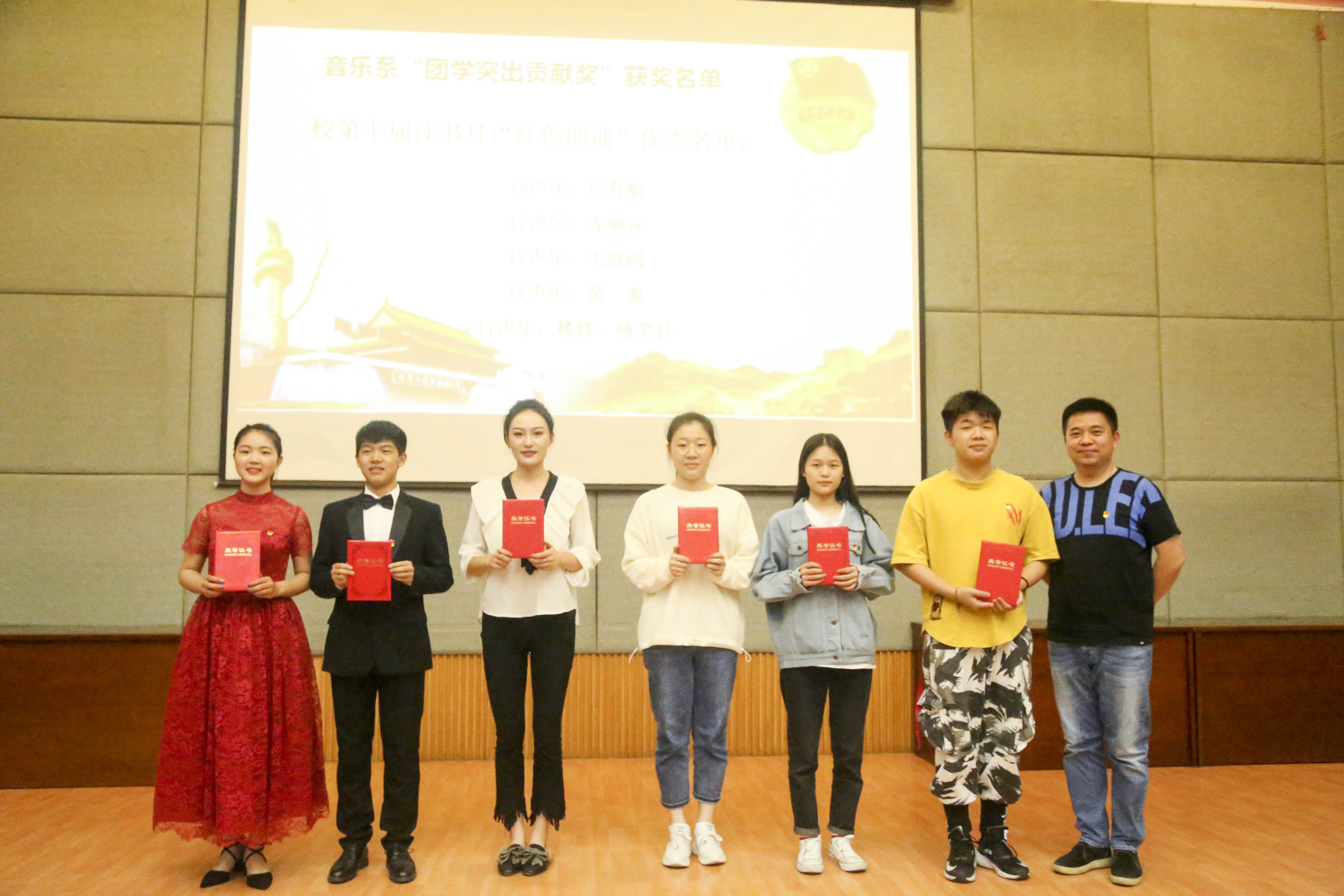 活动现场,对在日前结束的2019年学校红色经典诵读比赛、校园春季摄影征集大赛、浙江省第十五届大学生运动会比赛、音乐系“音你而辩”辩论赛中获奖的19名学生颁发音乐系“团学突出贡献奖”。同时,肯定了过去一年音乐系团学取得的成果,以及过去一年全体音乐系学子在各类比赛、各次志愿服务中展现出的良好风貌和优异成绩,肯定了过去一年音乐系在校园文化品牌建设、党建品牌培育中付出的努力。