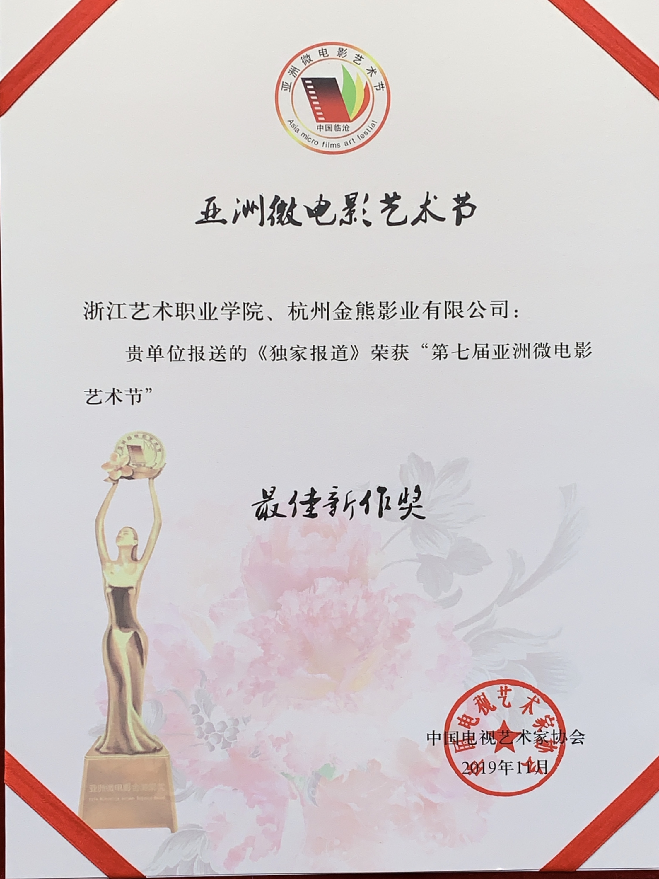 近日,第七届亚洲微电影艺术节年度盛典在云南省临沧市举行,由浙江艺术职业学院报送,浙艺创作中心导演张建成担任艺术指导,上海戏剧学院影视学院研究生张好担任导演的微电影《独家报道》荣获电影节“最佳新作奖”。亚洲微电影艺术节每一年能入围总评的作品只有百分之十左右,最终能获得最佳作品奖的作品只有百分之一左右。
