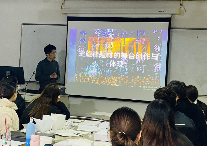 舞台影视美术设计与制作专业教师吴放的《影视舞台美术设计(一)》以2019年上海国际艺术节展演剧目大型交响诗《英雄颂》的创作为案例,通过自身的创作经历讲述《主旋律题材舞台创作与体现》的课程主题,使同学们在回溯近代中国史的过程中,了解中国革命的艰难与不易,培养爱国、爱党情怀。