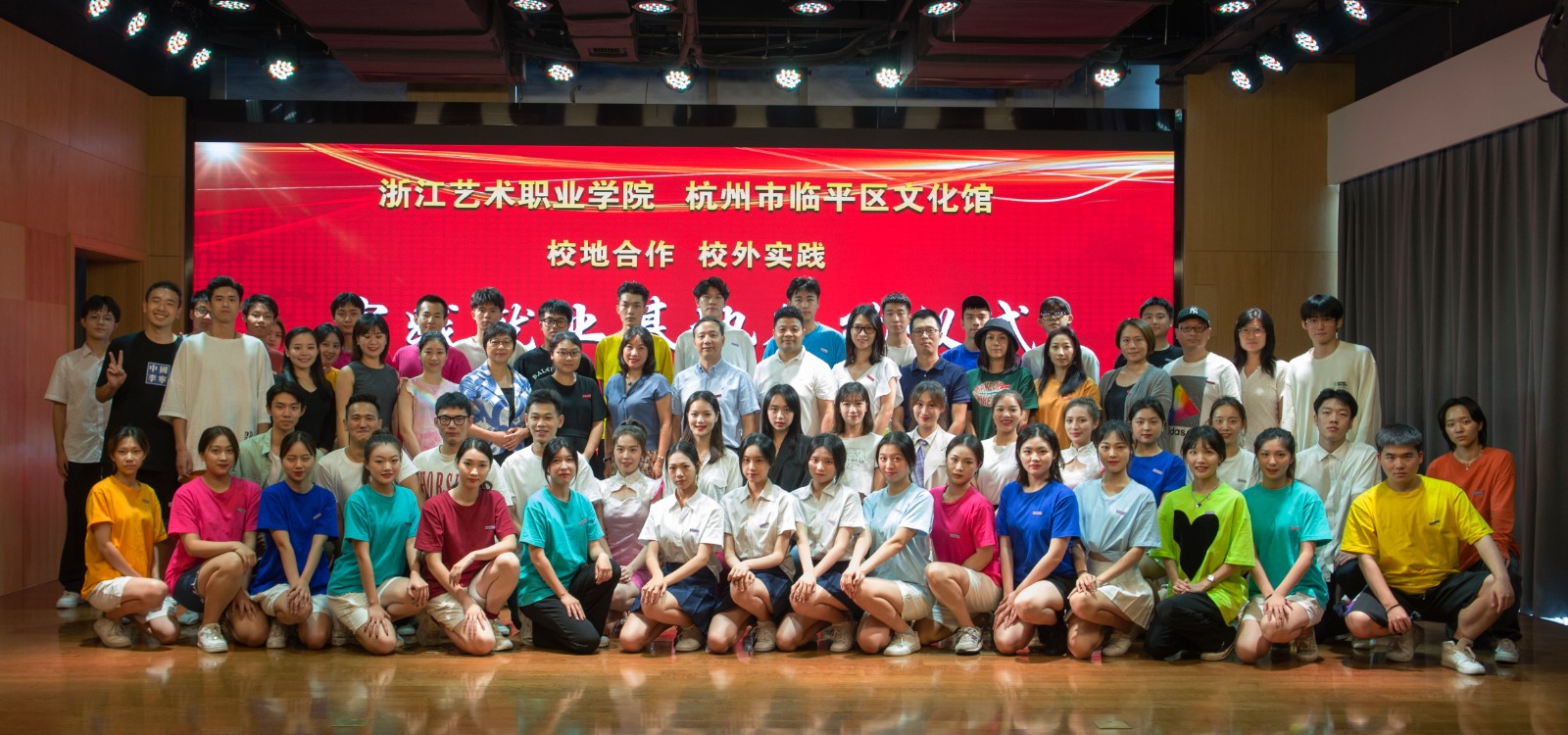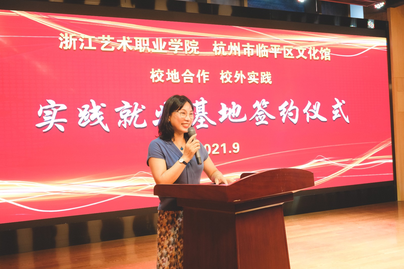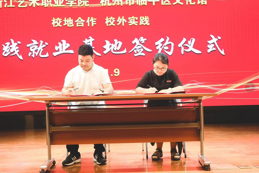 仪式上,临平区文化馆负责人任小伟与戏剧系党总支专职副书记许瑛代表校地双方签订校外实践就业基地协议。戏剧系副主任荆芳为实践就业基地授牌。
