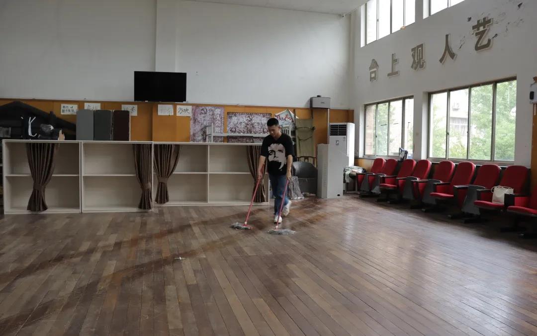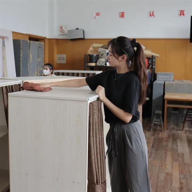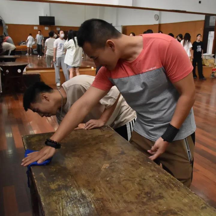 动员结束后,戏剧系同学们在老师的带领下,共同参与包干排练厅的打扫,从地面、窗户、墙壁,到花瓶、桌椅等各类道具,从分类归置到细致擦拭。在大家同心合力的辛勤劳动后,所有排练厅焕然如新,窗明几净,光彩夺目。