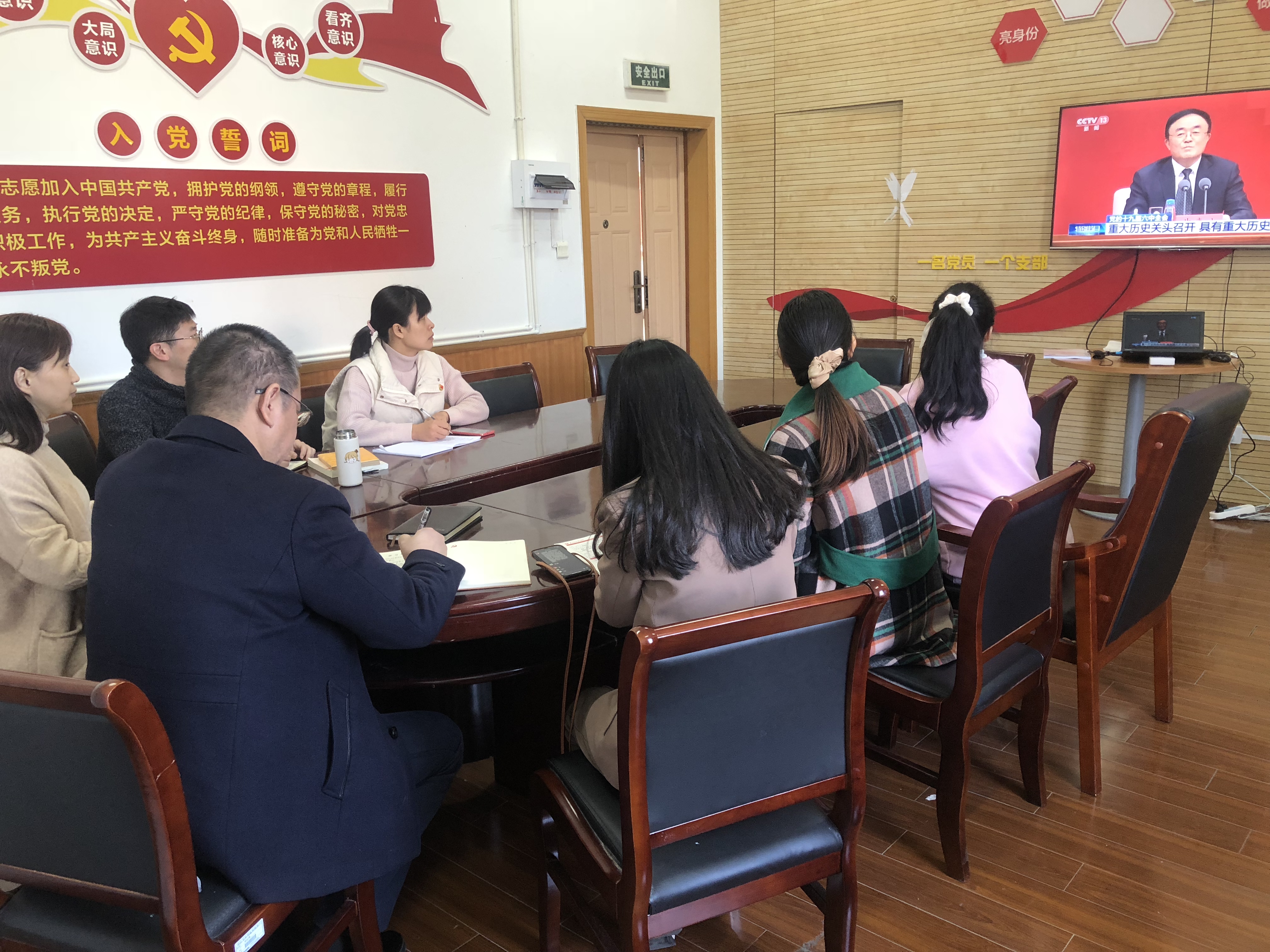 11月12日上午10时,直属社会科学部党支部组织全体党支部委员会委员、部门行政以及在校教师在13102会议室收看中国共产党第十九届中央委员会第六次全体会议新闻发布会,并开展交流讨论。其余未在校教师通过其他方式,第一时间收看此次新闻发布会,并以文字形式参加交流。