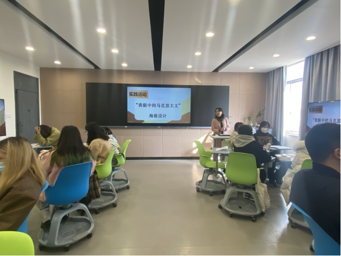 12月6日下午,社会科学部副主任、《马克思主义基本原理》课程主讲教师胡卓群在8707智慧教室开展《“我眼中的马克思主义”海报设计》实践教学活动课,课上邀请到美术系广告设计专业带头人、视觉传达设计专升本班班主任叶峰泉副教授作专业点评,美术系2021级视觉传达设计专升本班39名同学进行原创海报设计作品展示。