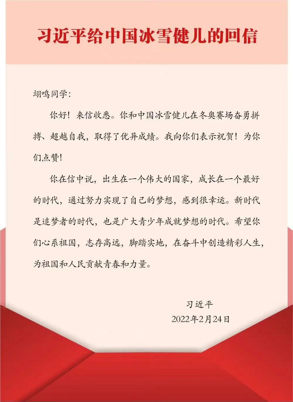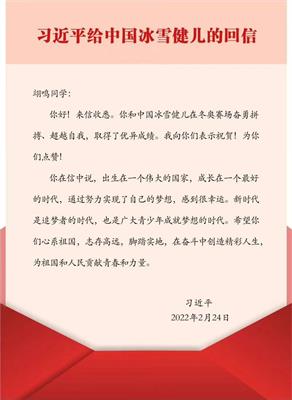 习近平总书记给苏翊鸣回信,向他和中国冰雪健儿取得优异成绩表示祝贺,并提出殷切期望。