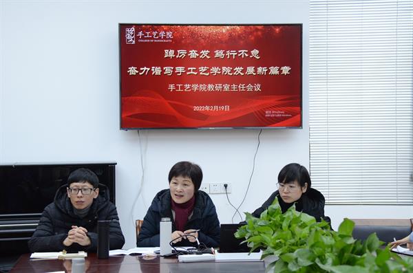 手工艺学院召开新学期教研室主任会议,手工艺学院领导班子与各教研室主任参会。会议以高标准谋划并推进学校“十四五”事业发展规划为目标,紧扣学院“十个一”各项工作重点,围绕提升专业内涵建设、拓展实践教学基地、提升师资队伍梯队建设、拓宽教学成果展示渠道等方面开展整体部署。