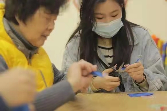 在活动中,同学们积极发挥专业优势,与老人共同完成手工花制作,拉近了彼此的距离。