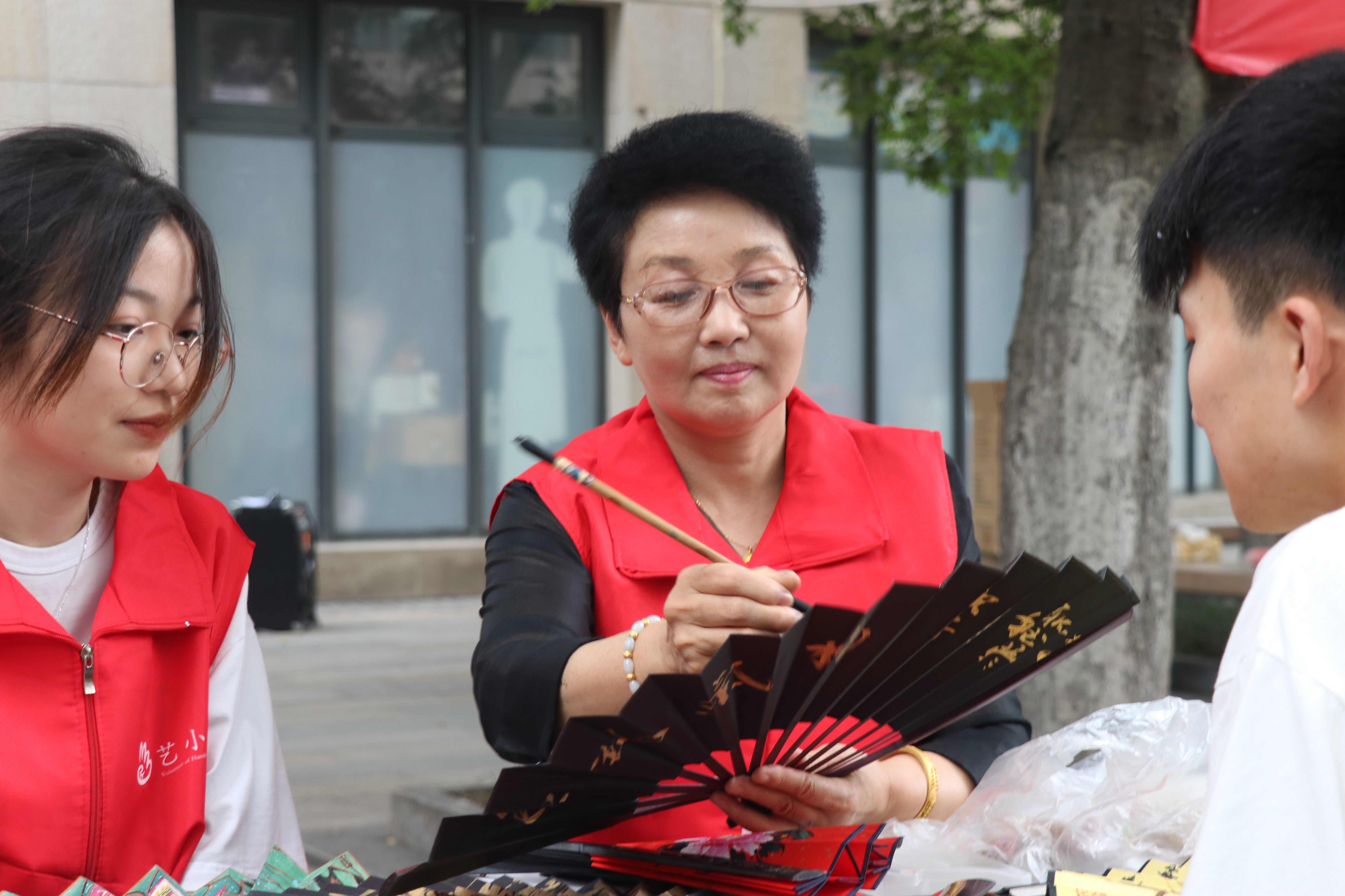 艺小匠们给现场体验者分发绘画工具和扇子,鼓励大家进行自由作画。在长方桌上,男女老少体验者对着空白的扇子聚精会神地描绘,有的画花卉,有的画粽子,有的写祝福,将一幅幅充满端午气氛的画作呈现在一把小小的扇子上。家住社区的耿老师笔法行如流水,扇面作品栩栩如生,一口气创作了四五把精美别致的扇面画。