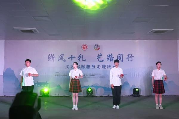 本次志愿文化服务分阶段进行,首次巡演来到了丽水的莲都、龙泉、庆元、景宁、云和等地,表演艺术专业2019级(五年一贯制)班的厉青轩、李和星、章泽能等10位同学表演了开场歌舞《浙风十礼》、群口相声《智能时代》、曲艺说唱《浙江有礼行天下》、歌舞《中国色彩》等,这些节目以接地气的主题、生动的生活气息和艺术感染力,赢得现场观众阵阵掌声。不仅通过全真实践环境锻造了同学的专业技能,也充分展现了演教学子一专多能、全面发展的专业特色。