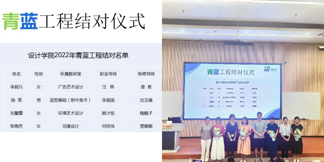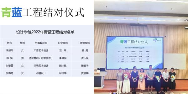 设计学院于2021年9月启动青蓝工程暨青年教师培养三年行动计划。今年,我院推行青年教师成长“双导师”制,为每位新入职青年教师配备由学院领导班子担任的职业导师和由教研室资深教师担任的师德导师,全面助力新教师成长成才。
