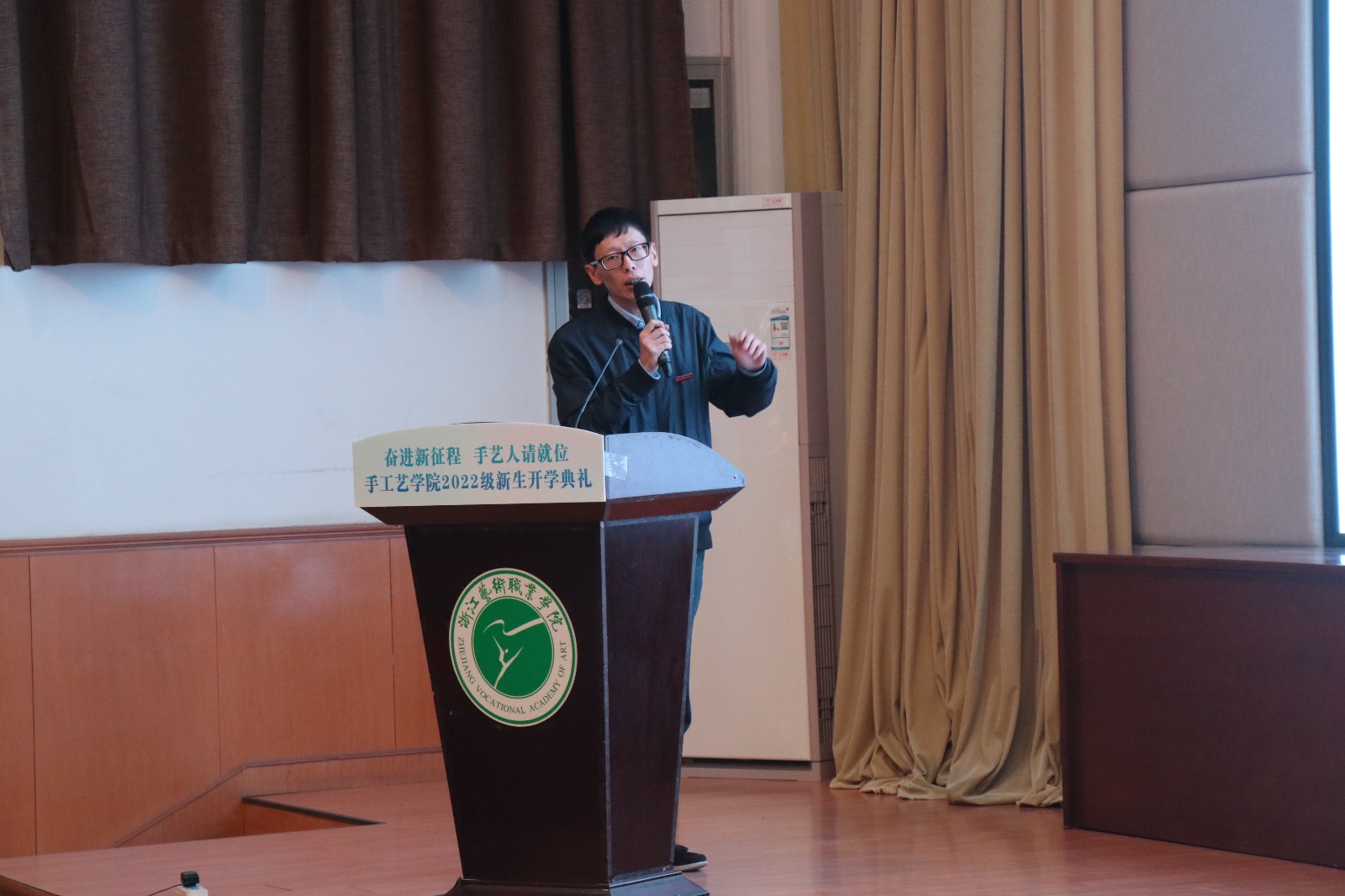 手工艺学院院长助理叶峰泉作“前行在手工艺学习之路上”主题讲解,向全体新生详细介绍了学分制课程结构、课程类型和职业技能鉴定等内容,生动具体地向大家展示了大学三年的学习过程,鼓励新生锐意进取做奋斗者,求真学问,练真手艺。
