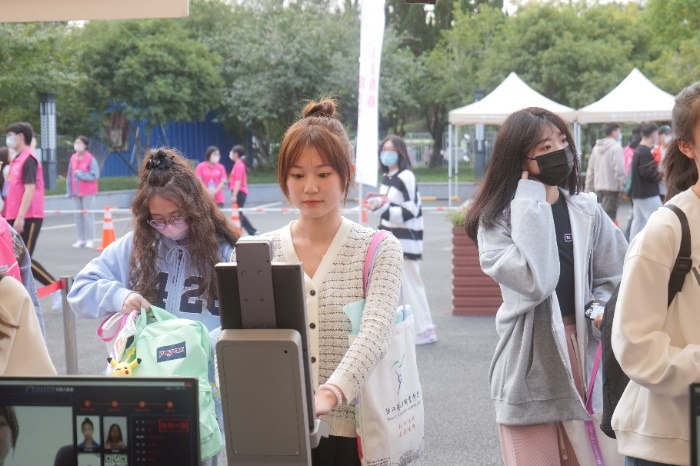 新生们手持各式KT板在背景板前打卡留念,在背景板上寻找自己的面孔,在“学生证”前留下入校的第一张照片。