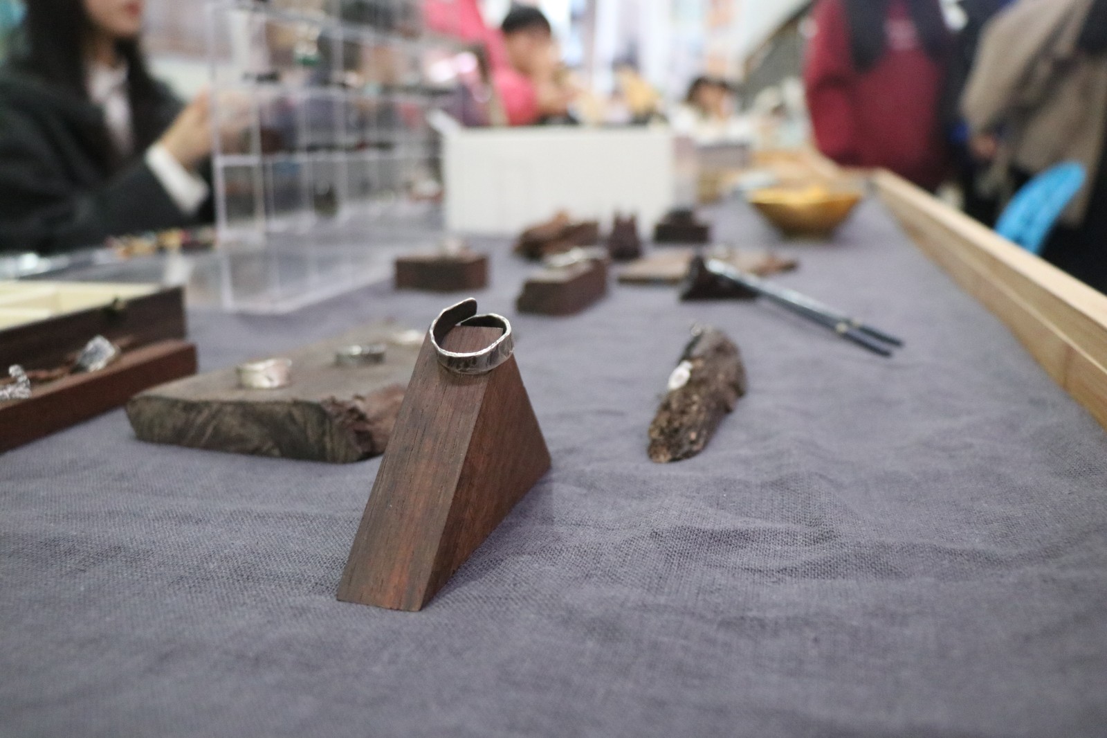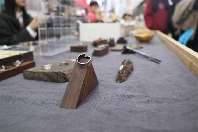 “传统书画装裱古籍修复”的摊位上,同学们可以了解到不同种类的古籍装帧类型,并体验线装本活动,深入感受文物修复的魅力。“金缮与器皿”摊位琳琅满目,以火枪加热银条而铸造的银戒,打磨檀木后镶嵌上琉璃的项链,上大漆推光后制成的落叶器皿,文物修复与保护专业的同学们让非遗传统技艺在文创产品中焕发出新的生机。