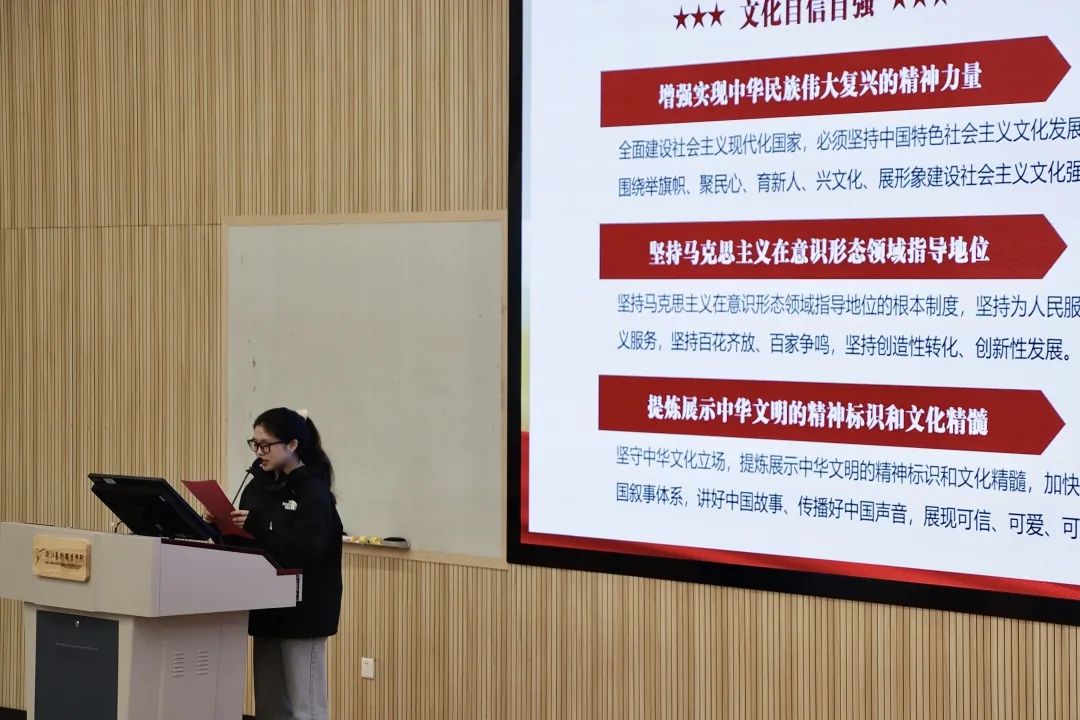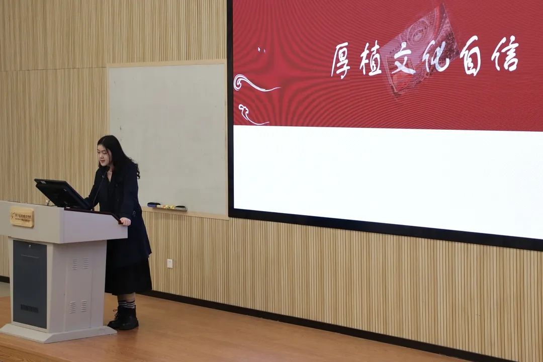 22定向1班的赵芯瑶以共产党百年历史为引,介绍了自己作为乡镇文化员的亲身经历,她在工作中与红色结缘、与古物对话,更加坚定了实打实干的奋斗目标。她号召青年要将自己的热情奉献给热爱的事业,在四季付出汗水,用美景描绘诗篇,担当起新时代赋予青年的责任。