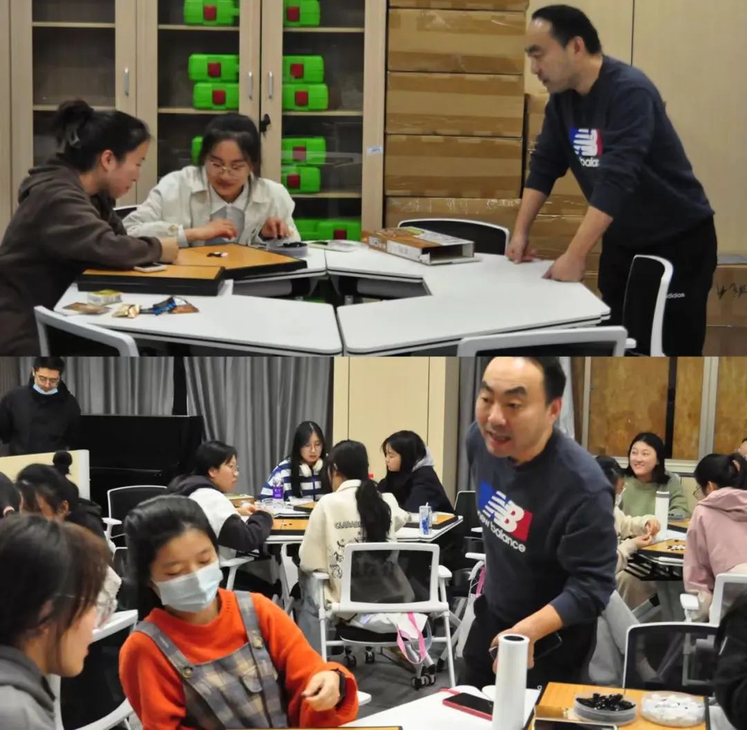 为了让大家在实践中更好地掌握理论知识,方栋在棋盘上摆出“扭十字”的布局,让同学们现场实践。虽然在座的很多同学都是第一次接触围棋,但是在王超骏和方栋两位老师的共同指导下,同学们两两相对而坐,在棋盘上排兵布阵、斗智斗勇。