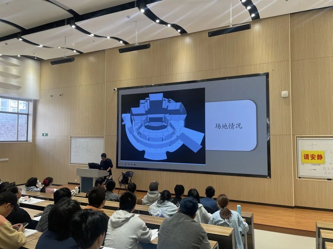 黄德聪从阐释多声道扩声声音设计的概念出发,为同学们介绍了设计项目和设计场地的现状,厘清了声音设计的思路,详细讲解了声场设计、音箱分布及整个系统的设计方式。本次演出以“宋韵”“诗路”为核心主题,通过三个篇章,六大精神实质,多种艺术表达,传递爱国、创新、包容的诗词文化,风雅精致的古典审美。