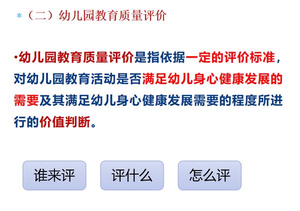 讲座伊始,罗妹以一所幼儿园简陋的美工区角为切入点,引出影响幼儿园教育质量的两类因素:硬件和软件。围绕“幼儿园教育质量评价”的概念,以现阶段幼儿园教育评估为例,总结出“谁来评”“怎么评”“评什么”三个构成此概念的因素。结合幼儿园教育质量评估标准,通过具体实例,将重点知识化抽象为具体,直观形象的教学方法,让学生对其有了更深刻的理解。
