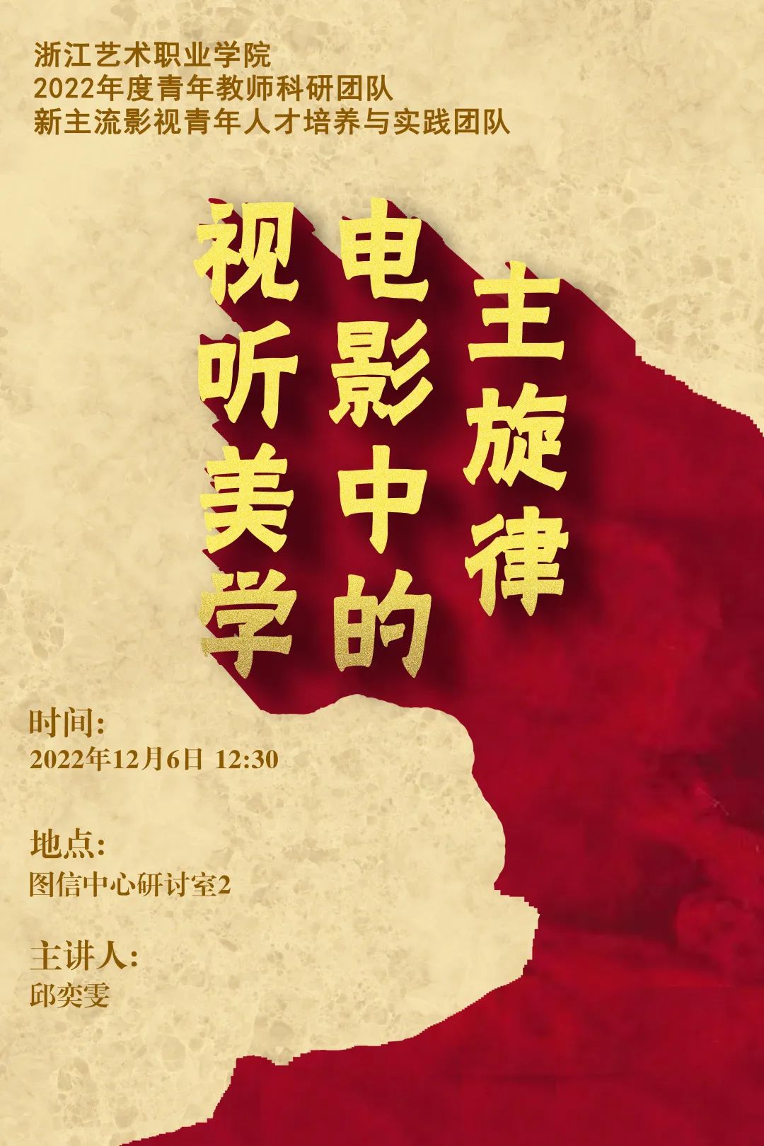 为使戏剧影视学院影视学生深入了解新主流影视作品的视听美学特征,感受新主流影视作品的魅力,12月6日,浙江艺术职业学院2022年度青年教师科研团队“新主流影视青年人才培养与实践团队”教师邱奕雯开展了《主旋律电影中的视听美学》学术讲座。