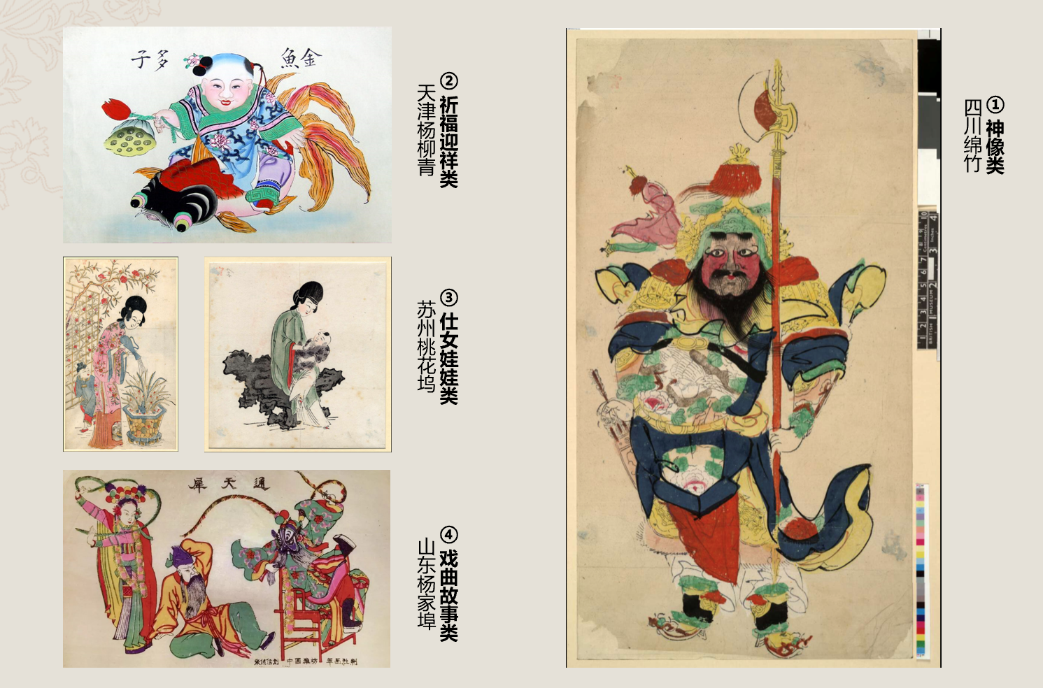 木刻年画的题材分为神像类、祈福迎祥类、仕女娃娃类等等。木刻年画的使用场景有门画、中堂、条屏、贡笺、灯屏画以及其他杂画等等。鉴于年画种类丰富多样,高迅重点介绍了门画这一场景,并对开门神的发展史进行了详细解读,介绍了近现代以来的门神,如神荼、郁垒、钟馗、赵公明等。