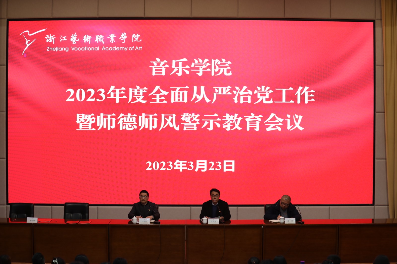 3月23日,音乐学院在学校图信中心报告厅召开2023年全面从严治党工作暨师德师风警示教育会议,传达学习二十届中央纪委二次全会、省纪委十五届二次全会、教育系统全面从严治党工作会议、省级宣传文化系统全面从严治党工作会议精神,传达学校全面从严治党工作会议精神,以“勤廉并重 廉洁从教”为主题,以高质量党建推动事业高质量发展,以高标准师德师风推进音乐学院校风学风教风作风。音乐学院领导班子成员、全体教职工参加会议,音乐学院党总支专职副书记刘梦伟主持会议。