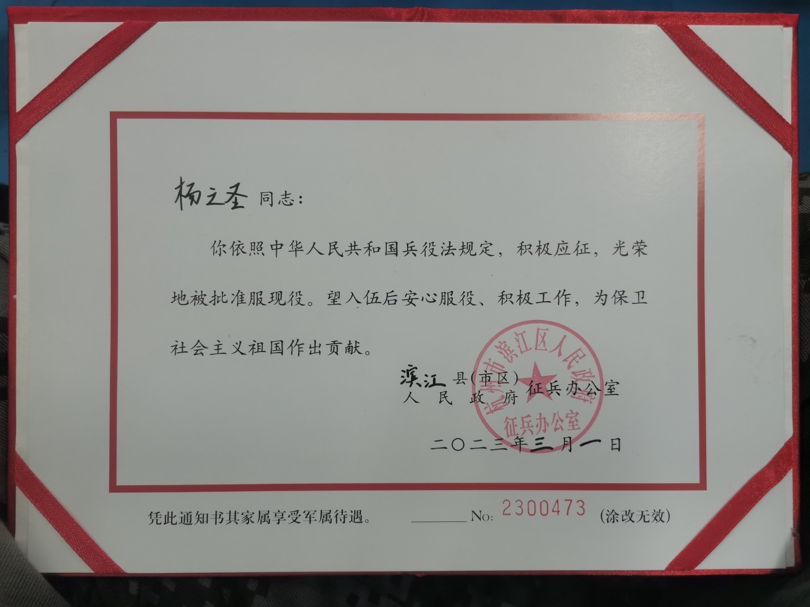 杨之圣的入伍通知书
