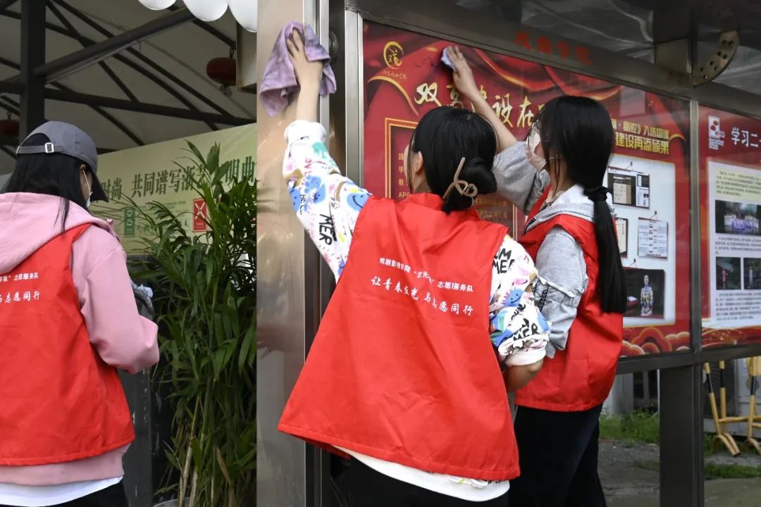 同学们认真清理着校园宣传栏上的灰尘,使原本有些许黯淡的宣传栏变得明亮通透、焕然一新。“艺光印象”志愿服务队中“小雷锋”们用实际行动弘扬“奉献、友爱、互助、进步”的志愿者精神和新时代雷锋精神。