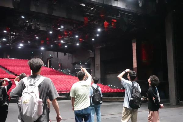 同学们走进演出《宋城千古情》的一号剧院,分成灯光、音响、舞台机械三个小组,轮流跟随剧场技术人员观摩《宋城千古情》灯光、音响及舞台机械设备的演示效果、操作原理,并动手体验。