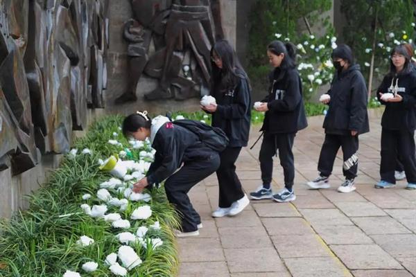 默哀毕,学生代表向革命烈士们敬献花篮。全体师生向烈士纪念碑行三鞠躬礼,随后绕烈士纪念碑一周,并敬献亲手制作的小白花,再次向革命烈士们致敬。