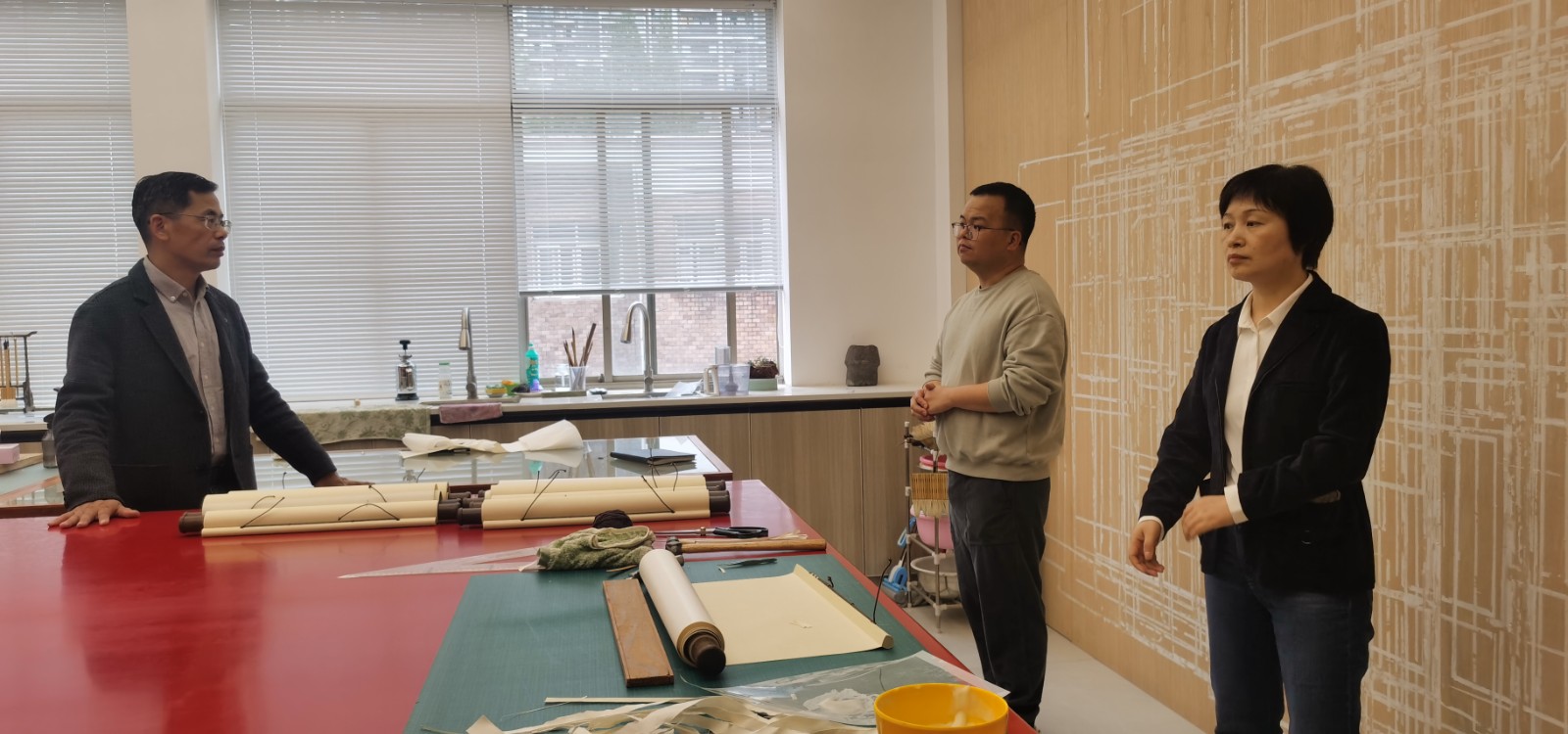 洽谈结束后,洪文祥一行参观走访了手工艺学院的实训室,近距离了解了文物修复与保护和民族传统技艺两个专业的课程教学内容与企业档案修复的匹配度,为双方的后续合作奠定了良好的基础。