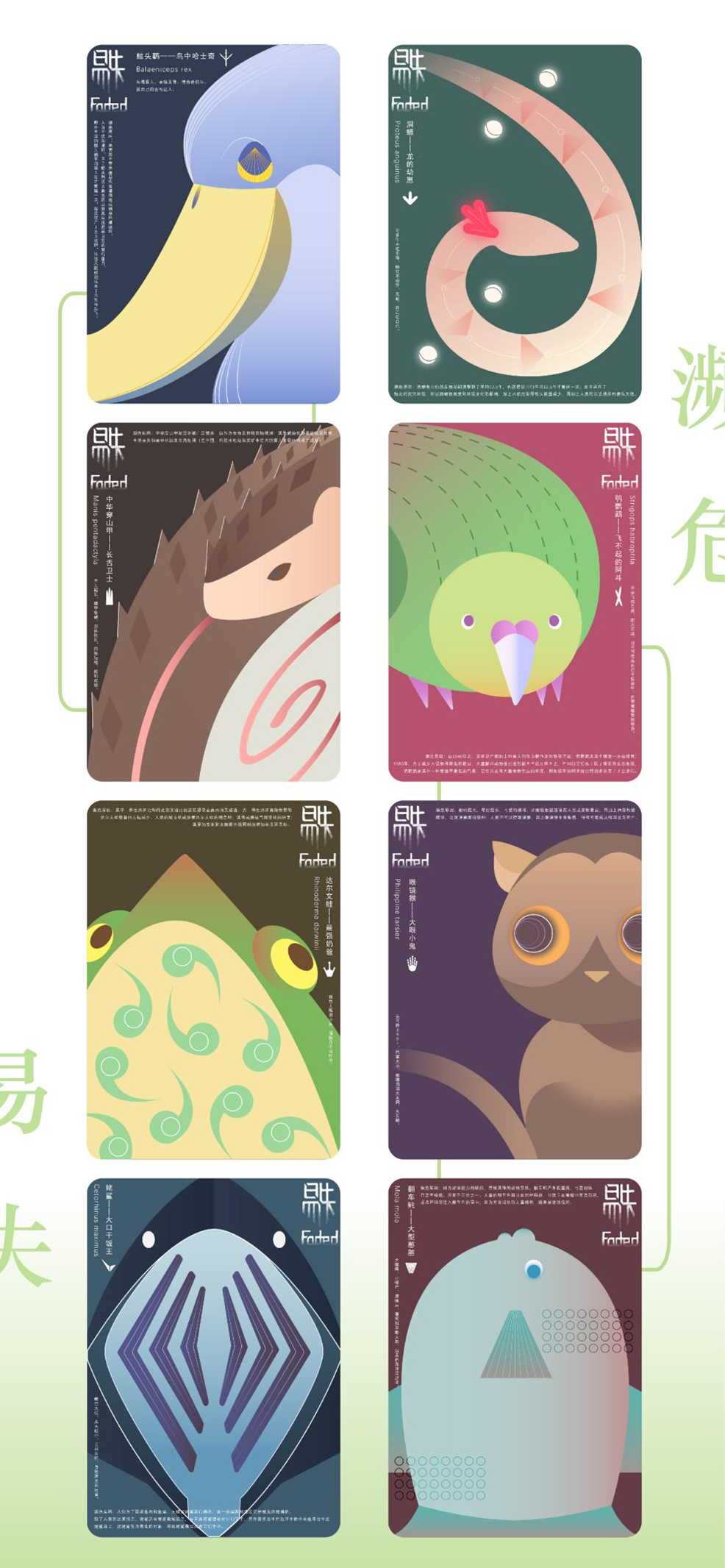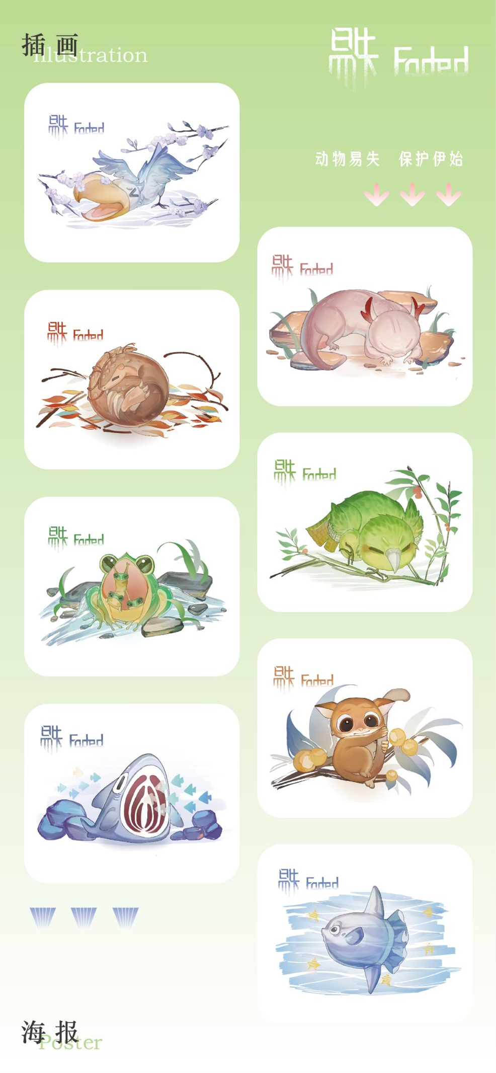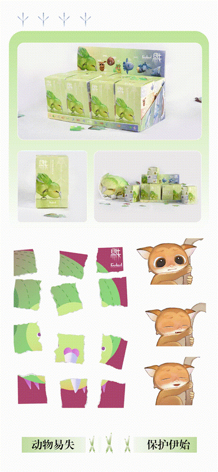 设计说明:大自然创造了许多美丽可爱、富有灵气的生命,但随着社会的极速发展,大量的生灵由于自然灾害、人类经济活动、栖息地的急剧变化、猎杀等原因濒临灭绝,令人痛惜。本主题以濒危动物保护为切入点,采用多元化的手法重塑濒危动物形象,通过文创设计的形式向大众普及濒危动物知识。作品通过抽象几何风格的海报、卡通萌系插画、动物信息科普可视化图表、live2D游戏互动、3D角色盲盒等表现形式,将二维与三维多媒体技术结合,以丰富新颖的视觉表现形式来呼吁社会对该话题的关注。