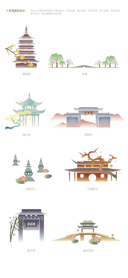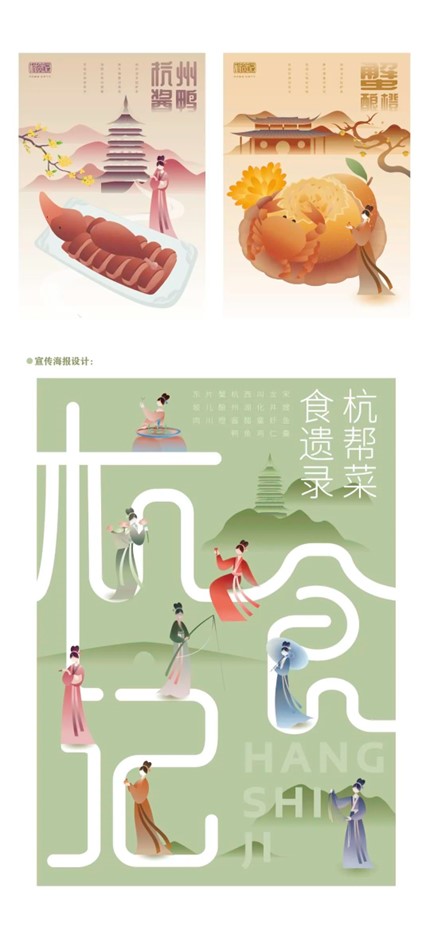 设计说明:该设计以“杭帮菜”为主题,旨在让更多人了解“杭帮菜”的特色与历史,宣传杭州的饮食文化。“杭帮菜”起源于距今一千多年的宋朝,我们将宋韵文化融入到视觉图形插画中,从多方面、多层次诠释“杭帮菜”的定义。以八种经典杭帮菜为主体,将杭州著名景点及建筑融入到花草树木、水泽山川中,再辅以“宋代女子”为蓝本设计的IP人物形象,以视觉鲜明的菜品、淡雅脱俗的景观、精巧动态的人物形象三者合一,创作出全方位宣扬“杭帮菜”与杭州饮食文化的作品。
