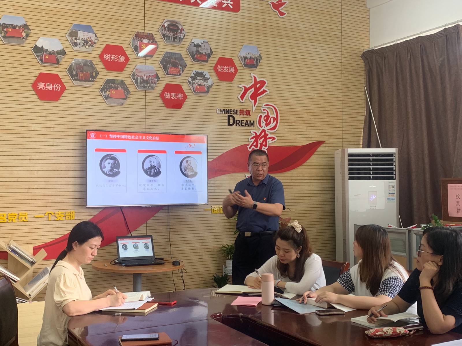 两堂主题党课,从同样的内容,不同角度对“文化自信”的进行了深入的解读,让大家感到收获颇丰。同时,在支部理论学习会上,结合学习6月2日习近平出席文化传承发展座谈会并发表重要讲话的精神,在场全体党员老师表示,作为新时代思政教师,要发挥先锋模范作用,充分利用马克思主义学院的专业优势,自觉担负起增强文化自信与传播中华文化的责任与使命,向学生讲好中国故事、传播好中国声音,展现可信、可爱、可敬的中国形象,让学生进一步坚定文化自信,坚守中华文化立场,积极传承与弘扬中华优秀传统文化。