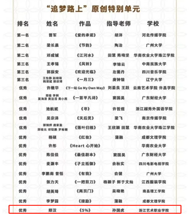 《5%》是我在浙艺的学习生涯中最后一部全程参与摄制的作品。它的完结,承载了我三年的时光,能够获得现在的成绩,离不开学校及老师们的支持和鼓励。感谢浙江艺术职业学院,感谢孙国虎老师的指导,感谢剧组每一位同学的付出,感谢社会各界人士的支持和配合……有你们的帮助才能让我们剧组圆梦。我们会继续在这条影视的道路上,不忘初心,争做一名新时代的影视追梦人。——19摄影摄像2班 郑汉