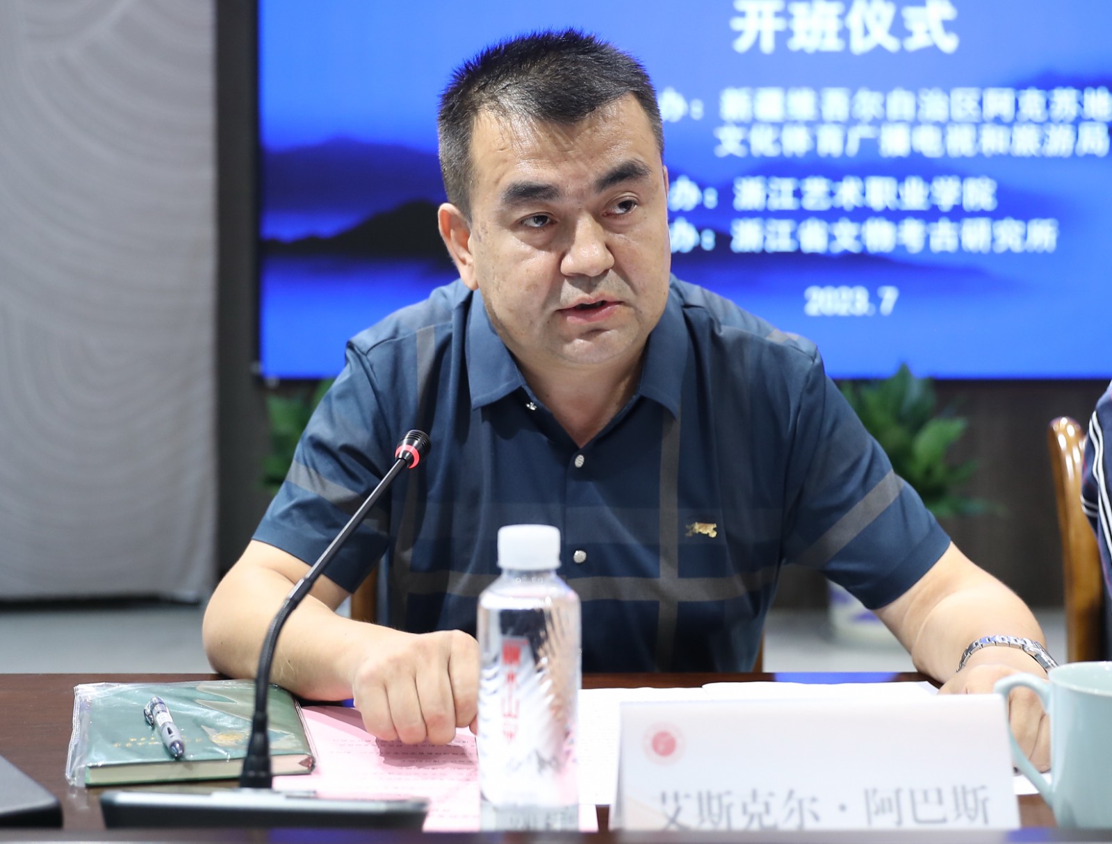 艾斯克尔·阿巴斯作开班动员。他代表阿克苏文旅局对给予关心、支持和帮助的浙江各级单位、专家表示感谢。他指出,举办培训班的目的是搭建一个相互了解、精度充电、交流提高的学习平台,培养一支综合素质高、专业技能强的高素质人才队伍,激发博工作者干事创业的工作热情,为阿克苏地区文博事业发展注入新的生机与活力。对本次班培训学员提出三点要求:首先要提高政治站位,统一思想认识,积极探索文博事业发展规律,学习借鉴浙江先进经验,加大文物保护展示利用力度,学会应用新技术、新方法,为今后迎接更大的挑战、取得更好的成绩打下坚实的基础;其次要认真贯彻落实,做到学思用结合,在深学践悟上多下功夫、在落地落实上多作文章;最后要严守培训纪律,提升培训实效,做到在思想上求实、作风上务实、行动上落实,牢固树立安全意识。