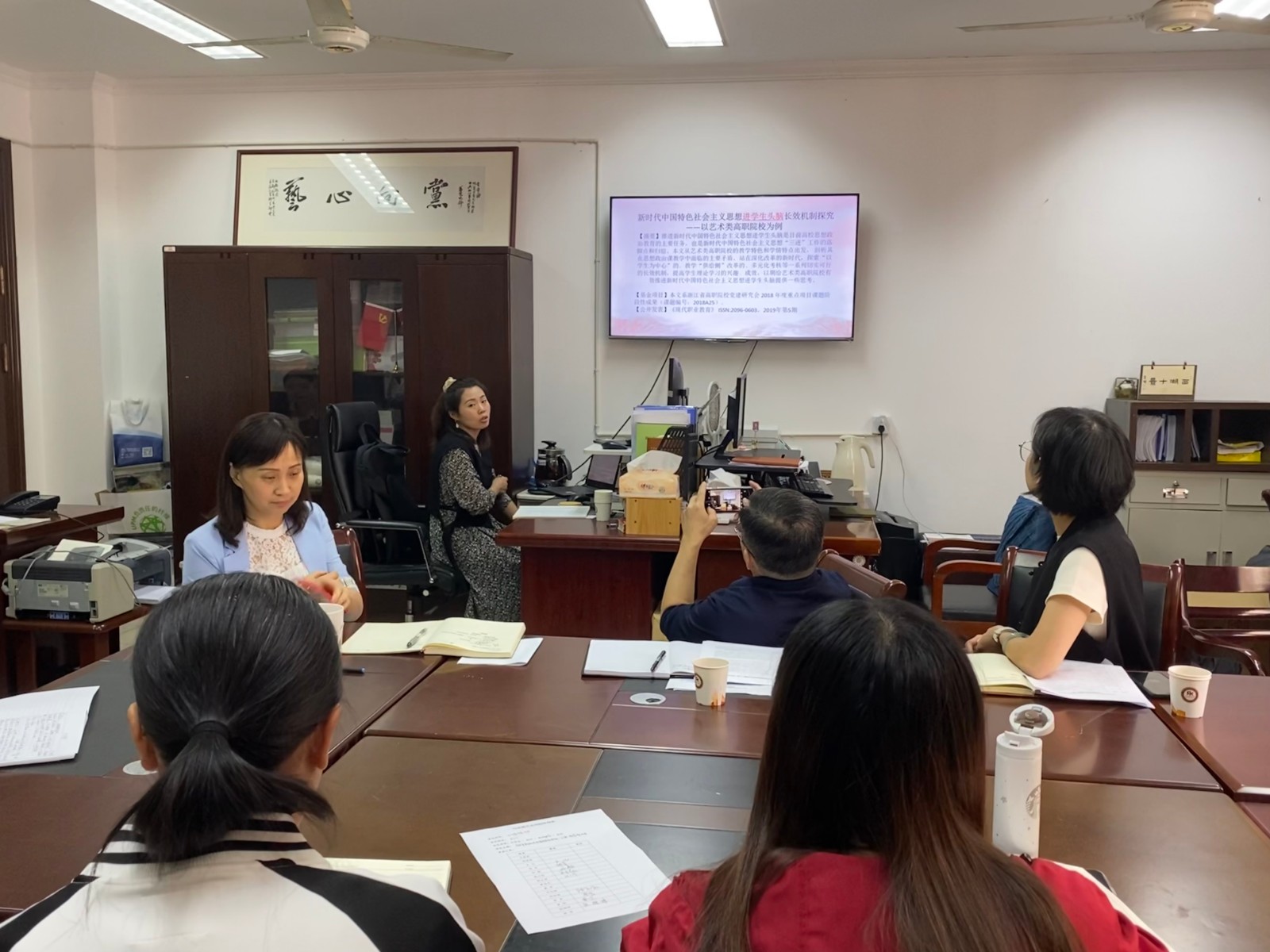 马克思主义学院副院长胡卓群在发言中表示,习近平新时代中国特色社会主义思想是当代中国马克思主义、二十一世纪马克思主义,马院要扎实推动“三进”的教学工作:坚持全面“进”,夯实必修课阵地,拓展选修课领域,加强校本教材的研发,充分发挥育人主渠道;坚持动态“进”,与时俱进汲取思想养分,充分转化为思政课的教学资源;坚持深入“进”,深入阐发习近平新时代中国特色社会主义思想的世界观和方法论;坚持灵活“进”,不断创新教学理念,增强教学针对性和实效性,从而提升习近平新时代中国特色社会主义思想的铸魂育人效果,打牢大学生成长成才的科学思想基础。