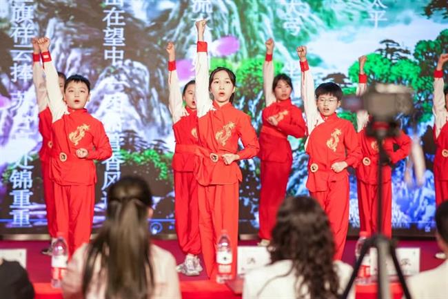 洪俊致辞。她首先代表京都小学全体师生对拱墅区文联、浙江艺术职业学院的领导和艺术家们多年以来对京都小学昆曲发展的关心和支持致以最衷心的感谢。她表示,京都小学一直非常重视传承和发扬祖国传统文化,通过多年的积累和积淀,已培养昆曲小爱好者600多名。如今人人知晓昆曲,人人会跳昆曲拳操,昆曲已成为京都小学一张响当当的艺术金名片。