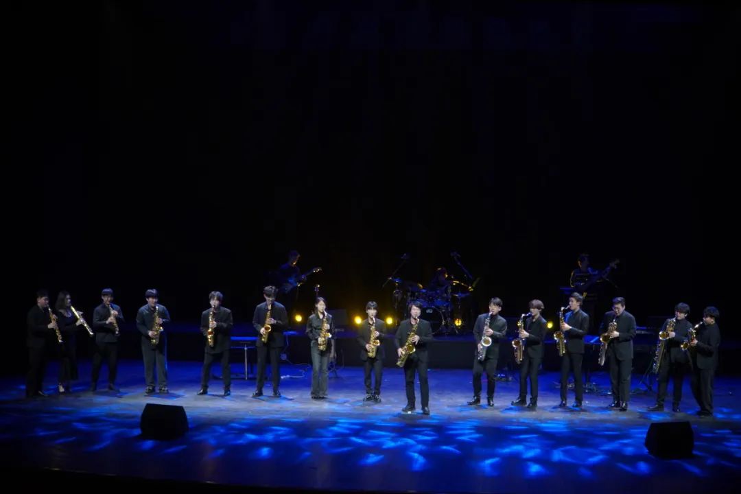 六点半,晚会正式开始。来自22音乐剧的刘颖霏同学担任本场音乐会的主持人。由Z萨克斯乐团演奏的燃情《萨萨舞曲》拉开了音乐会序幕,场内气氛瞬间沸腾起来。意犹未尽时,迎来了第二首曲目——funk 音乐经典之作《Pick Up the Pieces》,陈淇、金星、鲁晟杰、金玥炜、俞哲楠五位萨克斯乐手轮番上阵,此起彼伏的音符表达极具张力,令人陶醉。