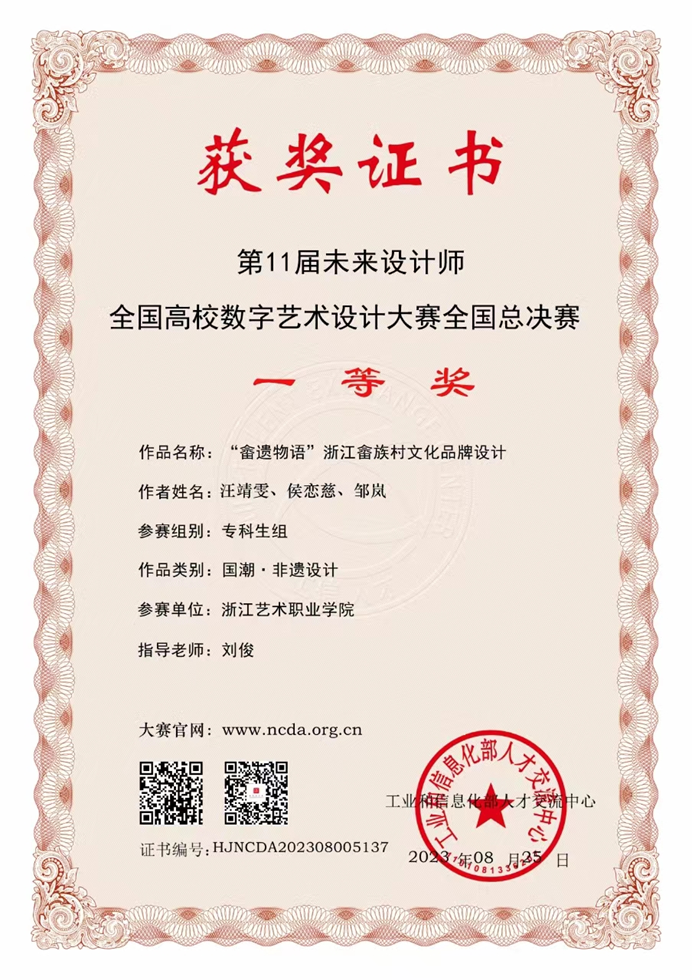 经过激烈的角逐和层层选拔,设计学院广告艺术设计专业师生在此次大赛中获得优异成绩,专业教师刘俊指导学生汪靖雯、侯恋慈、邹岚的作品《“畲遗物语”浙江畲族村文化品牌设计》获全国总决赛一等奖,刘俊获优秀指导教师。专业教师商易文指导学生傅馨怡、吴小可的作品《“点亮诗路”非遗无骨花灯的视觉活化与衍生》获全国总决赛二等奖,商易文获优秀指导教师。