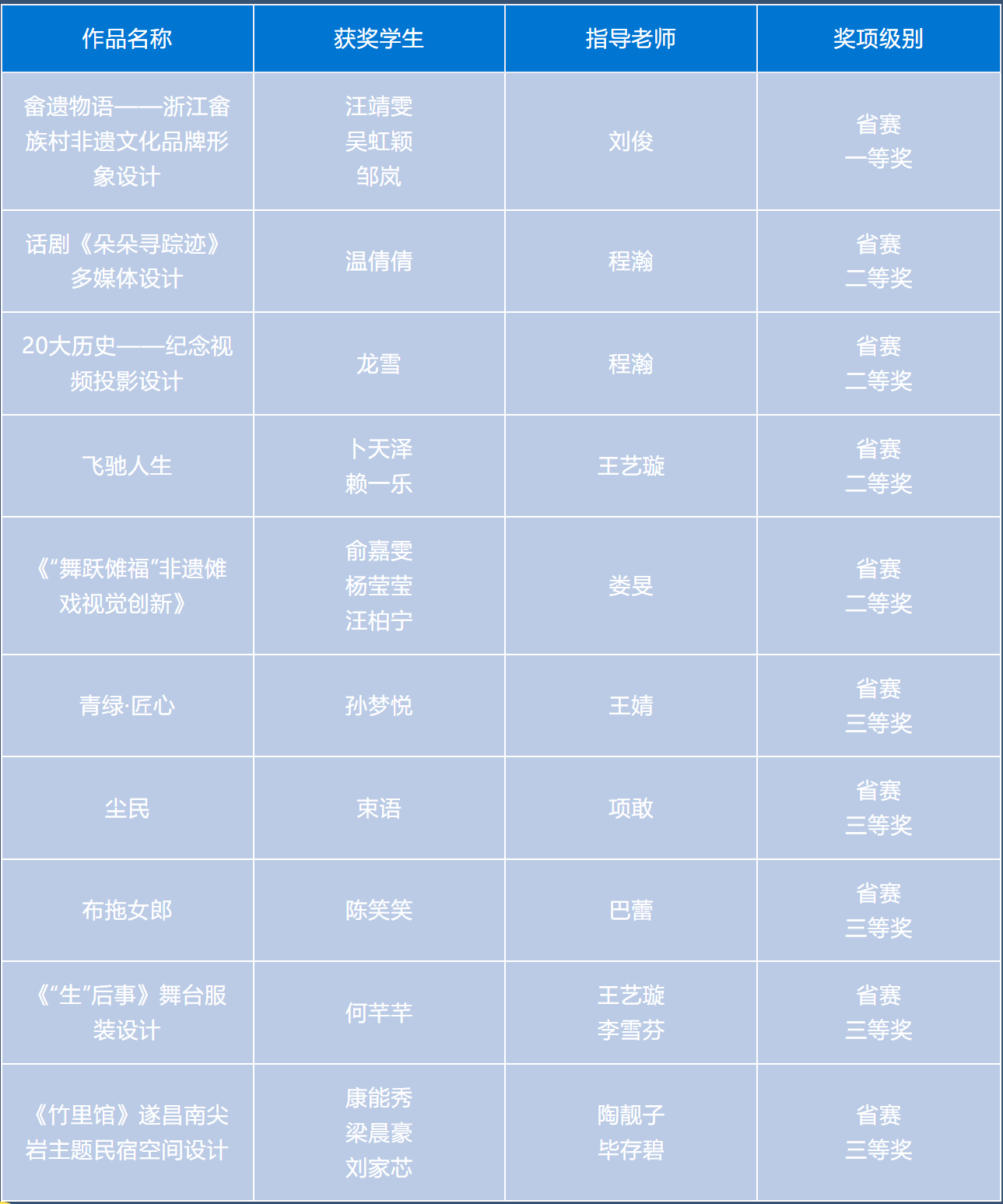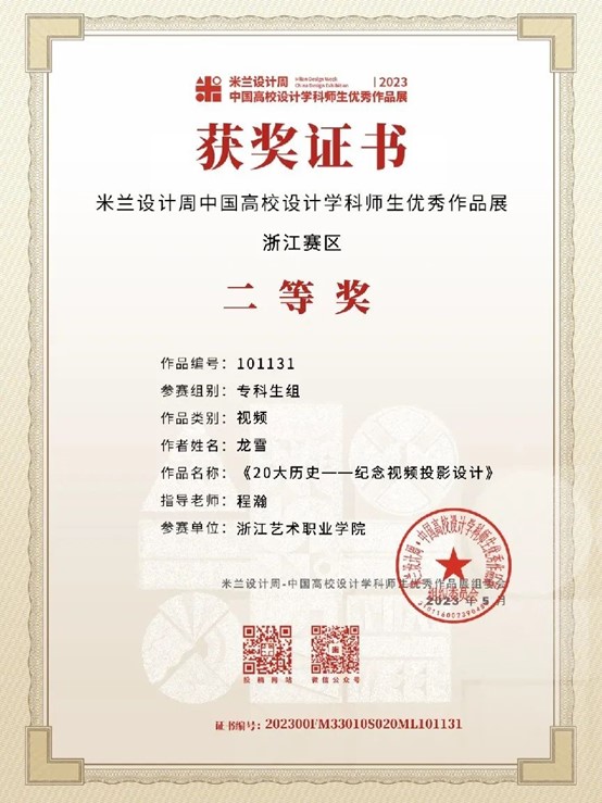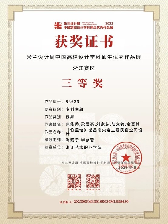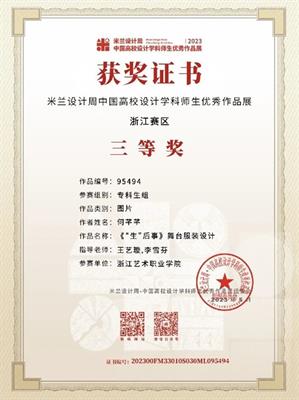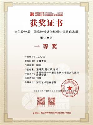 为提高学生运用知识解决实际问题的能力,积极鼓励学生参加各类专业竞赛,培养具有创新精神和实践能力的高素质技术技能人才。近日,由设计学院各专业教师指导的学生作品在2023“米兰设计周——中国高校设计学科师生优秀作品展”中喜获佳绩。经过校内选拔、浙江赛区选拔,作品获得国赛一等奖1项,三等奖1项;浙江赛区获省一等奖1项、二等奖4项、三等奖5项的好成绩。