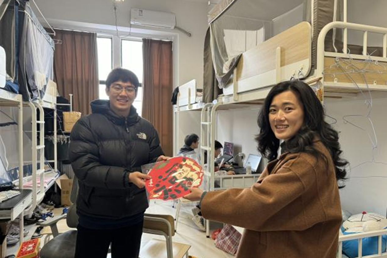 设计学院领导班子、全体班主任和辅导员走访学生寝室,细心查看宿舍环境,关注每一位学生的返校情况,询问学生的学习生活需求,为学生送上关怀,叮嘱学生认真完成劳动教育,保持整洁干净的寝室卫生环境。老师们还精心准备了富含龙年元素的春联、挂件,写满了对学生的美好寄语,让浓浓的年味与深深的人文关怀交织在一起。