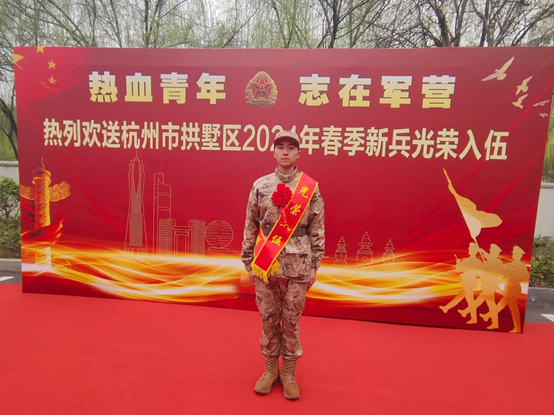 当日,在杭州市拱墅区参加征兵仪式的还有2023级环境艺术设计2班的殷天赐,他平日里与同学们相处融洽,在学习上积极进取,生活中严格自律,乐于助人、无私奉献,获得了老师和同学们的一致认可。