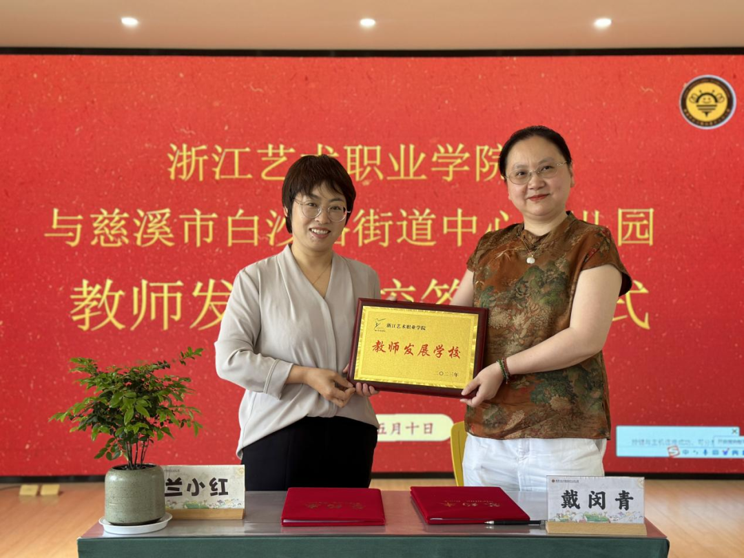 慈溪市白沙路街道中心幼儿园园长兰小红、书记翁建浩等对我院一行的到来表示热烈欢迎。兰小红院长介绍了幼儿园“一花一树一世界,顺势顺行顺导入”的办园理念和劳动教育的办园特色。戴闵青将我院学前教育的发展特点及优势与对方作了介绍,表达了与幼儿园建立长期合作的意向,共同探索生源地实习实践模式,培养学前教育领域人才。双方就教师发展学校的设立达成共识并签订了合作协议,举行了授牌仪式。